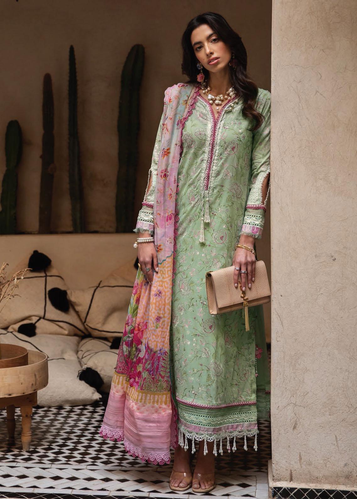 Mint Debagh is not your typical lawn outfit. Simply sumptuous soft PIMA lawn fabric serves as the canvas for dainty fresh embroidery in the most delicate shades of pinks and purples highlighted by custom embroidered neckline, sleeves, pants and daaman borders, designed to uplift the entire ensemble. A plush, airy, pure chiffon dupatta with romantic elements in fresh, eye catching hues imbues a distinctly timeless quality to this outfit.