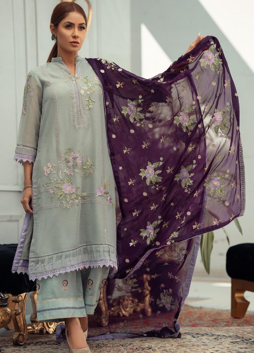 Divine - a blend of beautiful colors embroidered over the ensemble. This 3 pc unstitched chiffon suit is a sea green outfit paired with a pink organza dupatta. Having a blend of floral embroidery all over, which depicts the real floral art and gets you blooming.
