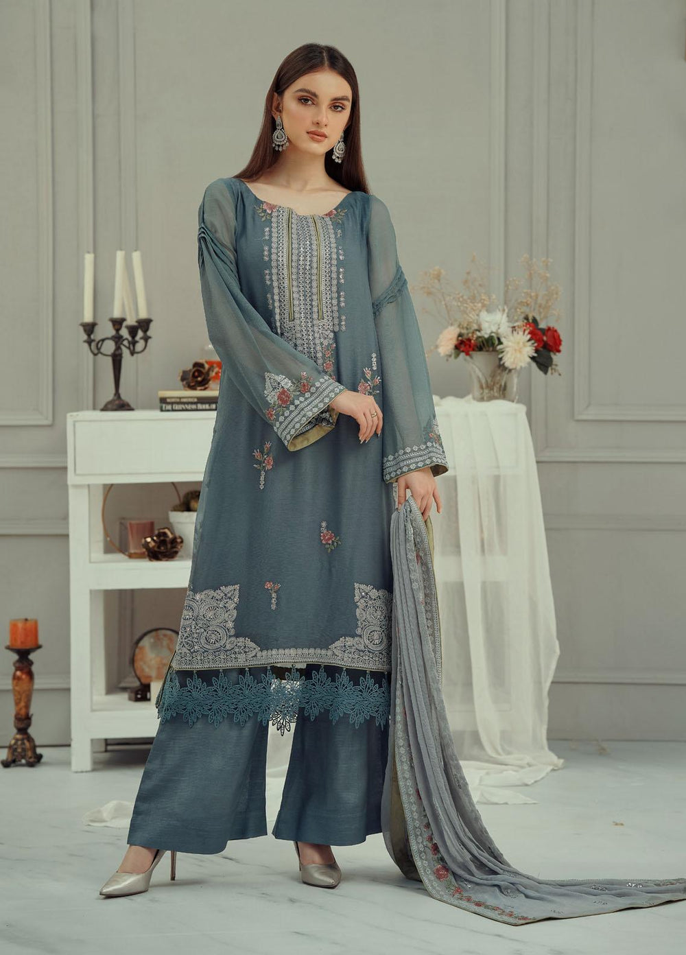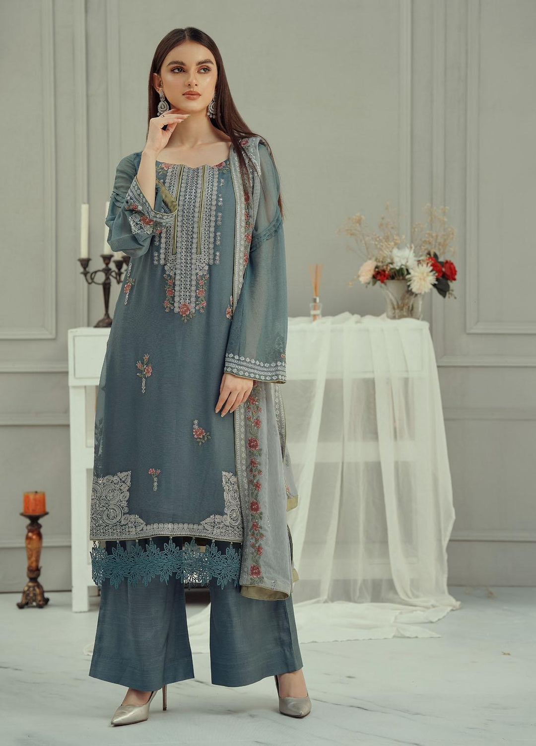 Iberis - a masterpiece of elegance and beauty. Iberis is one the most beautiful outfits from the Fascino La Flora collection. It's an embroidered 3-pc chiffon suit coming in a contrasting pastel blue shade. Having a light blue fully embroidered chiffon bottom open shirt  and raw silk trouser paired with a dark blue shaded embroidered organza dupatta.