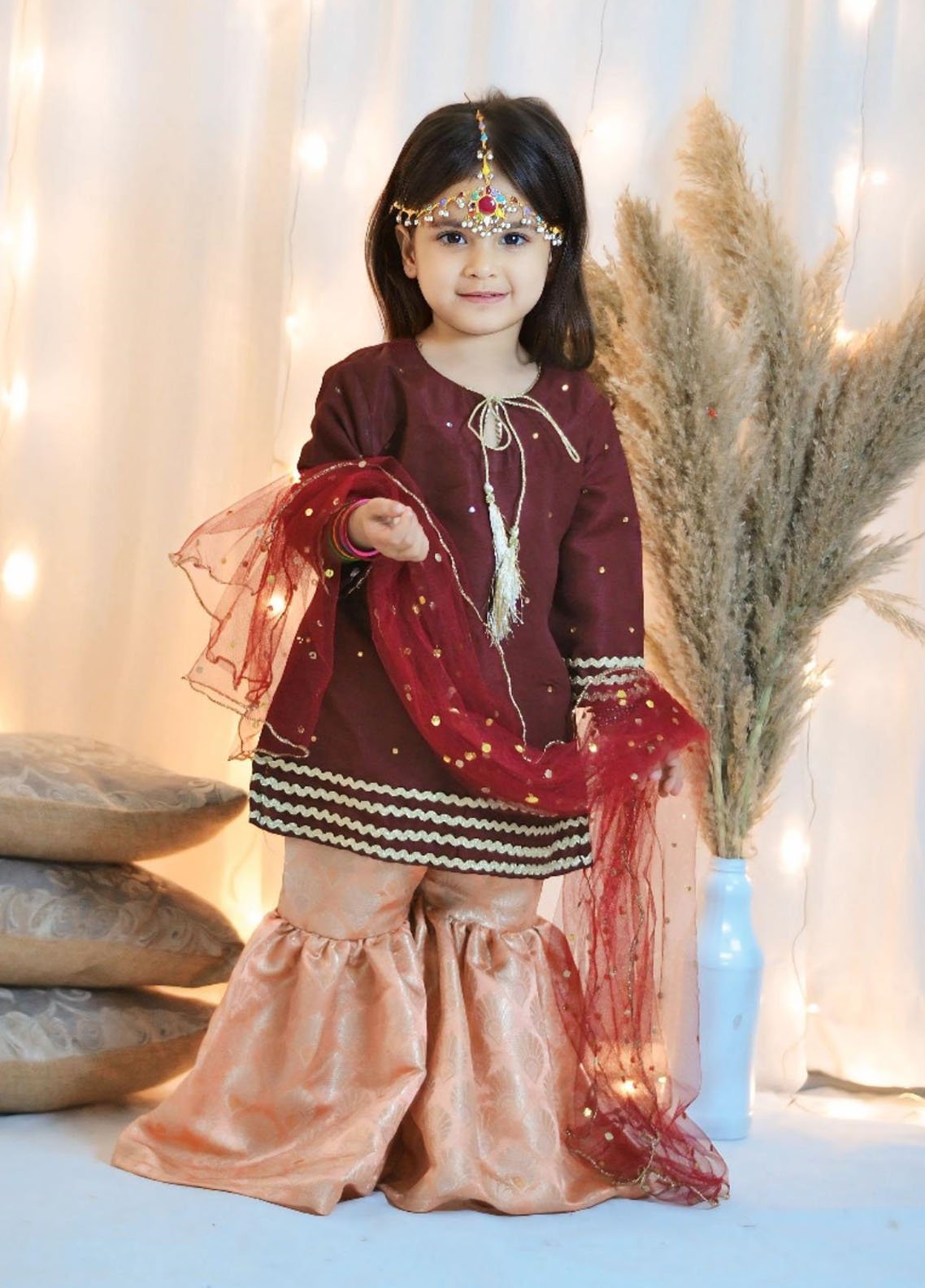 Mom4Little Pret Embroidered Raw Silk 3 Piece Maroon Gharara Set