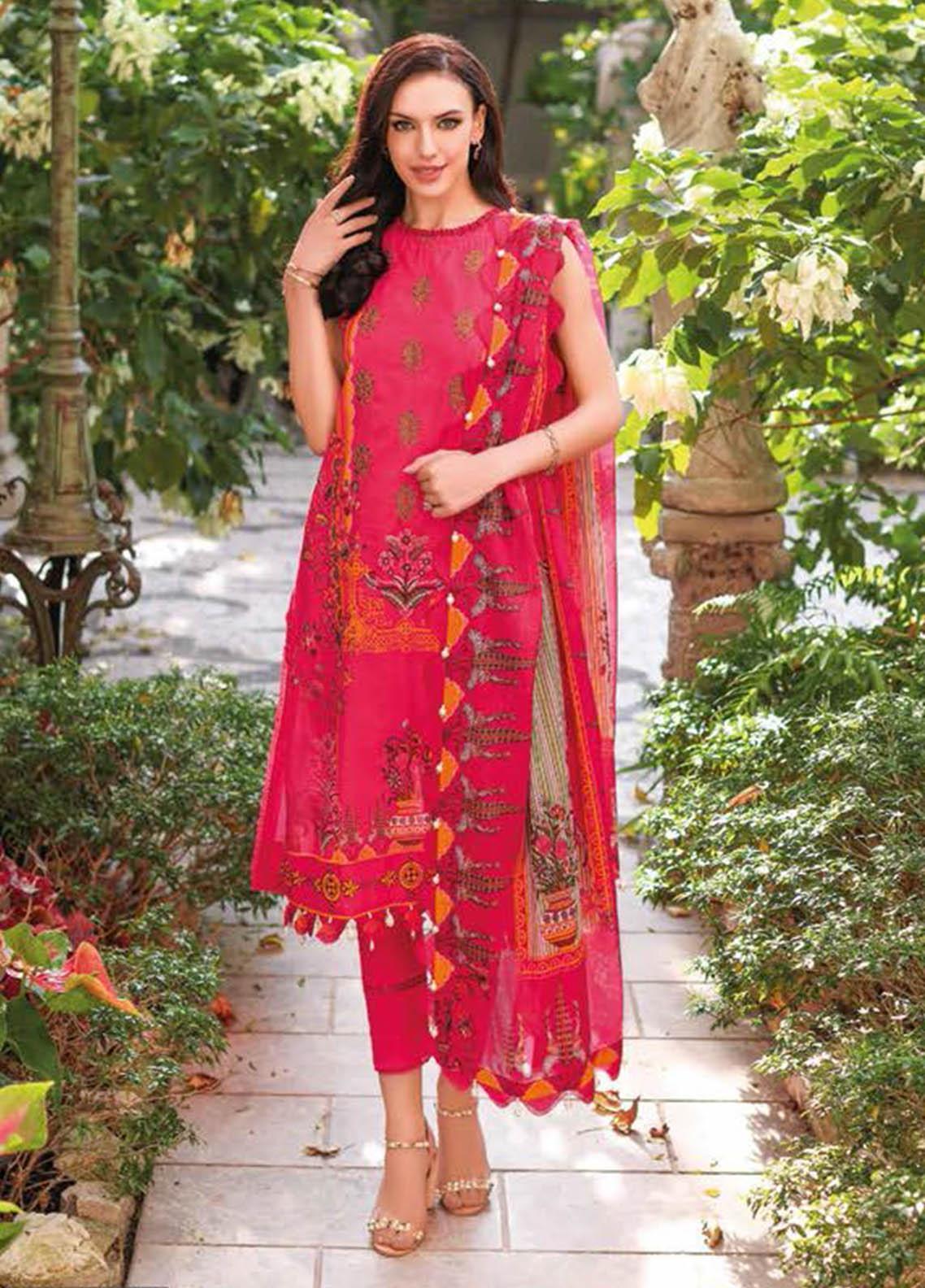 Printed Lawn Dupatta. Embroidered Printed Lawn Front with Printed Lawn Back and Sleeves. Dyed Trouser.