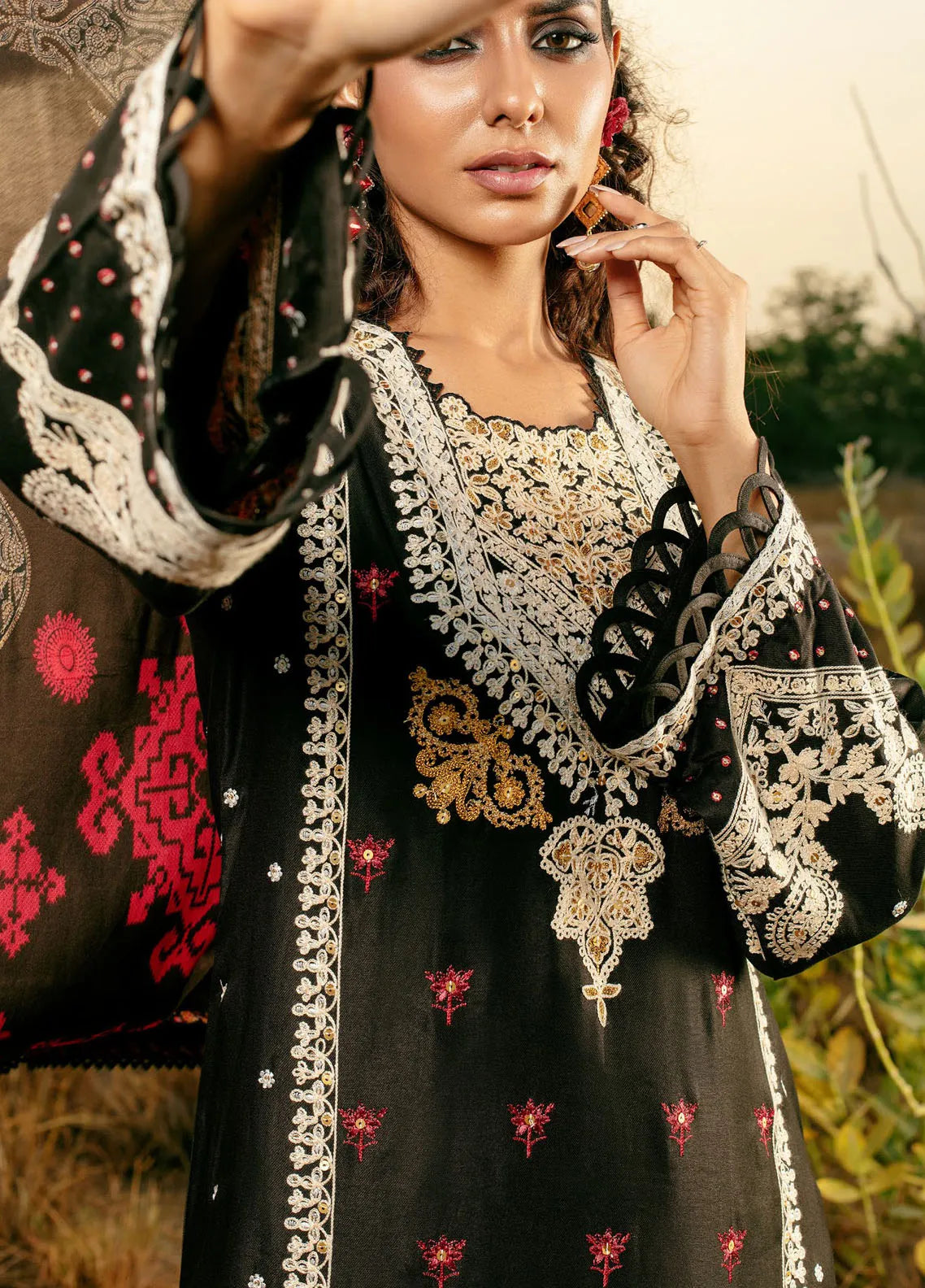 - Printed Twill Cotton Linen Dupatta. Embroidered Cotail Shirt Front, Back And Sleeves. Embroidered Cotail Borders For Front And Back. Dyed Trouser.
