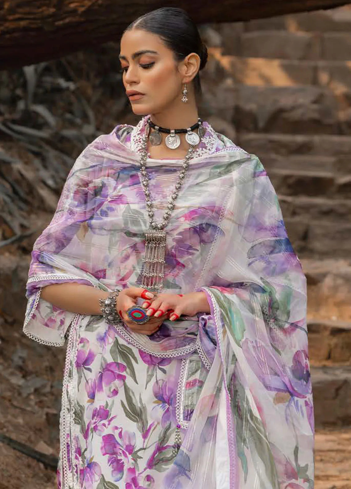 • Printed Lurex Chiffon Dupatta. Printed Lawn Shirt. Dyed Trouser.
