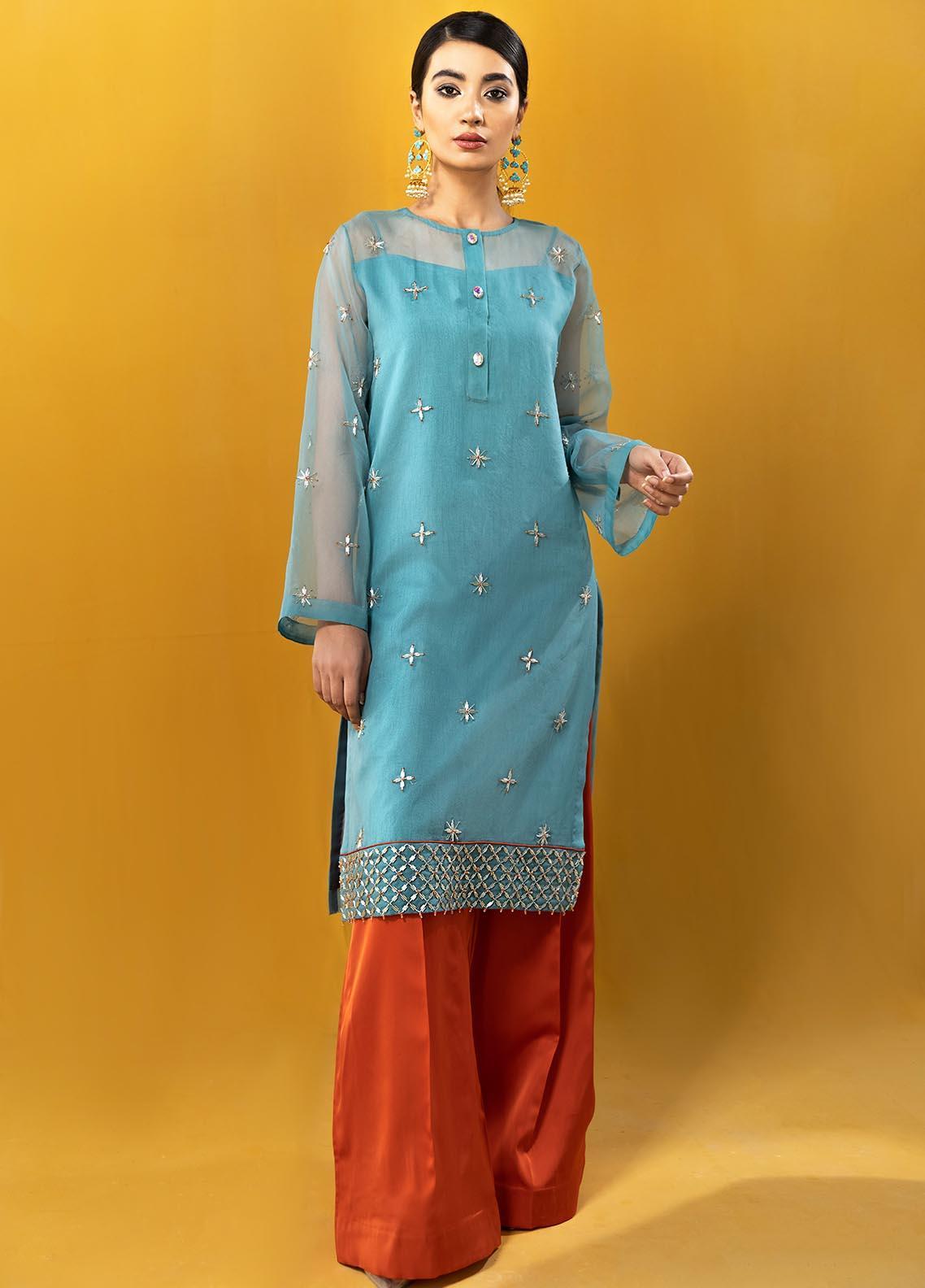 Allure, an elegant combination of basic cutline in statement colour combo.Mid length shirt comes with a ban patti and and kurta sleeves.Eye catching firozi Organza shirt is embellished with silver and rust arrangement of pipes and crystals on front, sleeves and border.Paired with loose, flowy, contrasting, pure rust Organza satin palazzo
