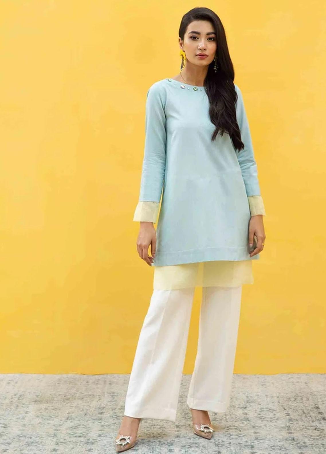 Two pearls is a short length viscose shirt made in hues of greens. Contrasting yellow organza layer adds detail and style to the outfit. Neckline is embellished with stones to make it a must buy. Pair it with off white straight pants