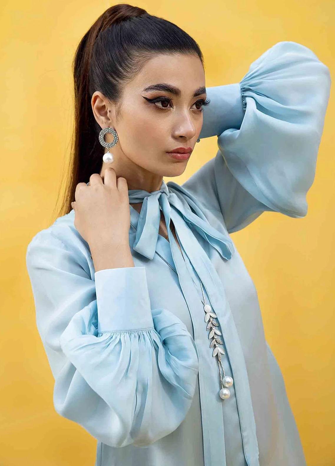Angels light is a perfect outfit for any friends gathering. It is a long flowy shirt having ban and bow details at the neckline. Cuffs and buttons at the sleeves along with the embellished flower on the side make it a trendy outfit