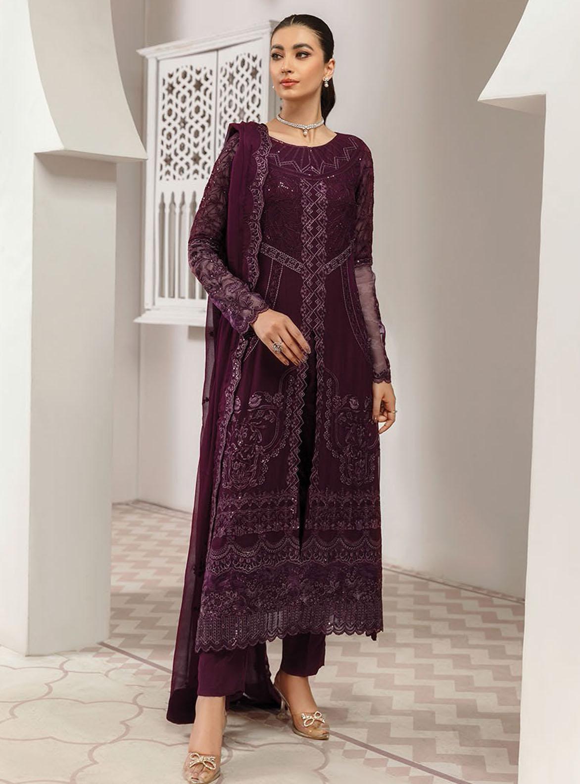 Embroidered Chiffon Suits Unstitched 3 PieceEmbroidered Chiffon Front Right Panel Embroidered Chiffon Front Left Panel Embroidered Chiffon Back Embroidered Chiffon Sleeves Embroidered Organza Front Borders Embroidered Organz A Back Borders Embroidered Organza Sleeves Border Embroidered Chiffon Dupatta Raw Silk Trouser