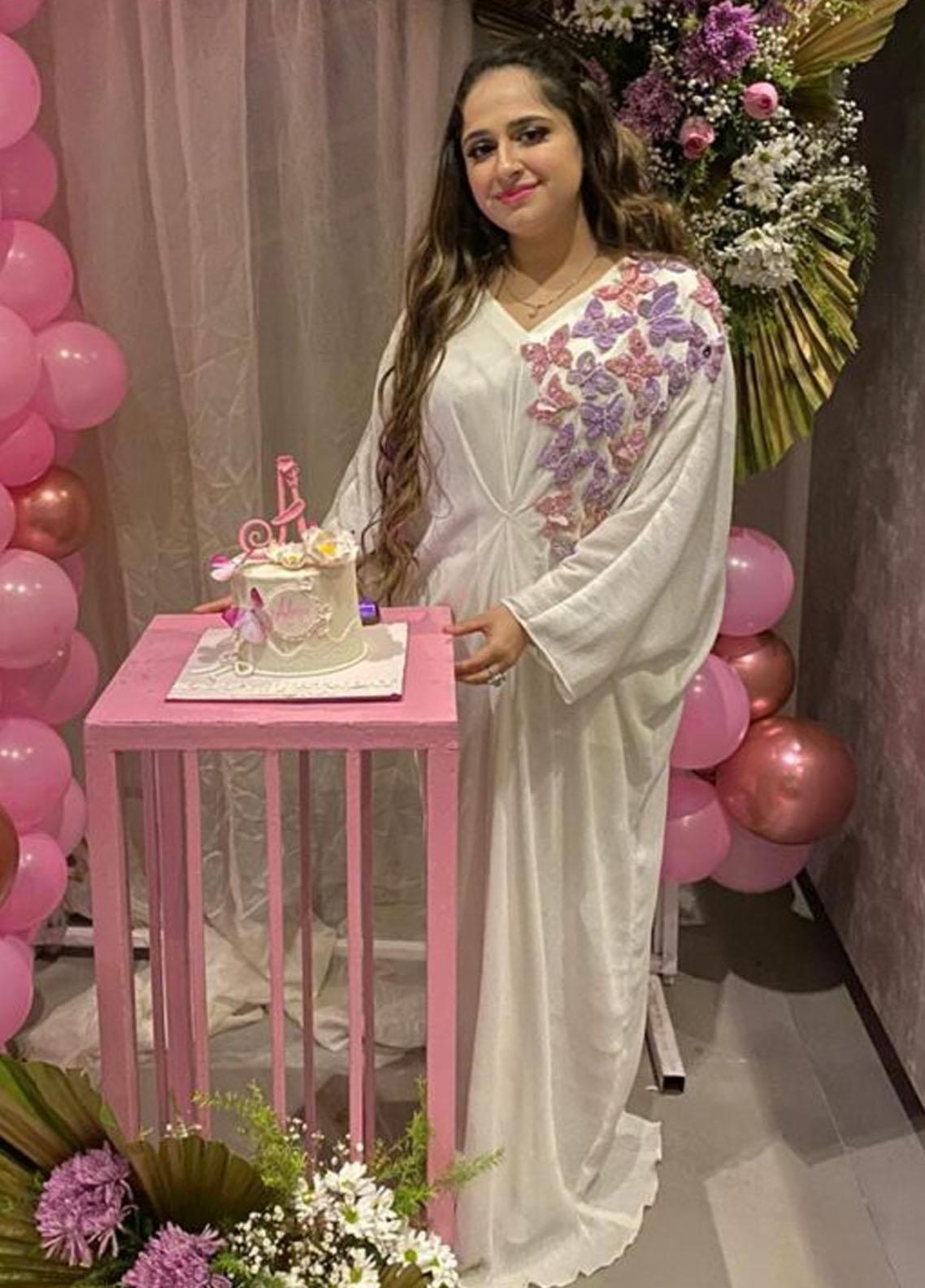 This White Grip Chiffon Kaftaan Has A Customize Name Insert On One Side Of The Sleeve And A Beautiful 3D Embellished Bunch Of Butterflies