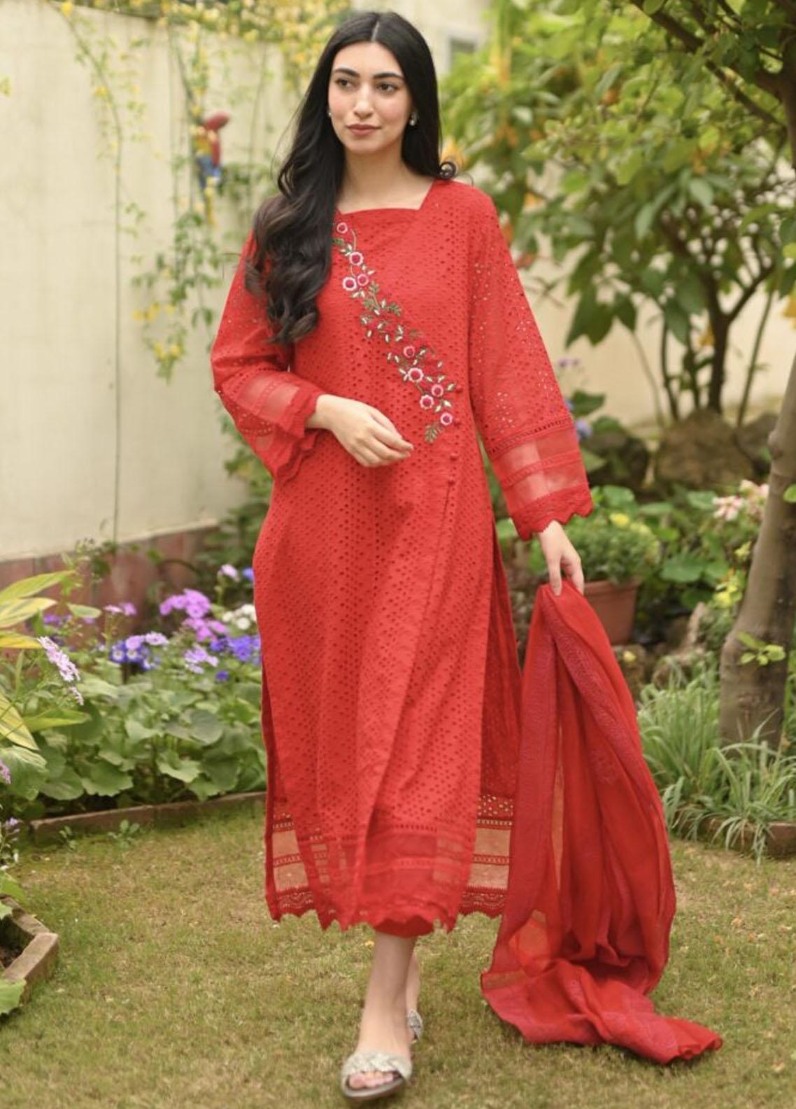 This Beautiful Red On A Chicken Shirt Has Resham Tanks Knots Handwork On The Angrakha Cut Finished With Laces And Orange A Details On Hem And Sleeves. We Have Paired This Angrakha With Straight Pants And Silk Cotton Net Dupatta.