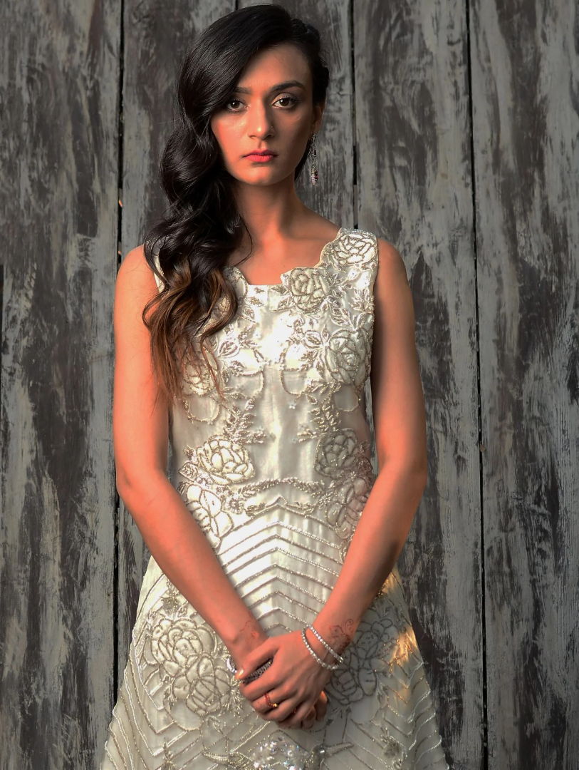 THIS WHITE ON WHITE FORMAL GOWN IS FULLY EMBELLISHED WITH 3D MODERN TECHNIQUE WORK AND VELVET APPLIQUES. THE FRONT AND BACK IS FULLY EMBELLISHED.