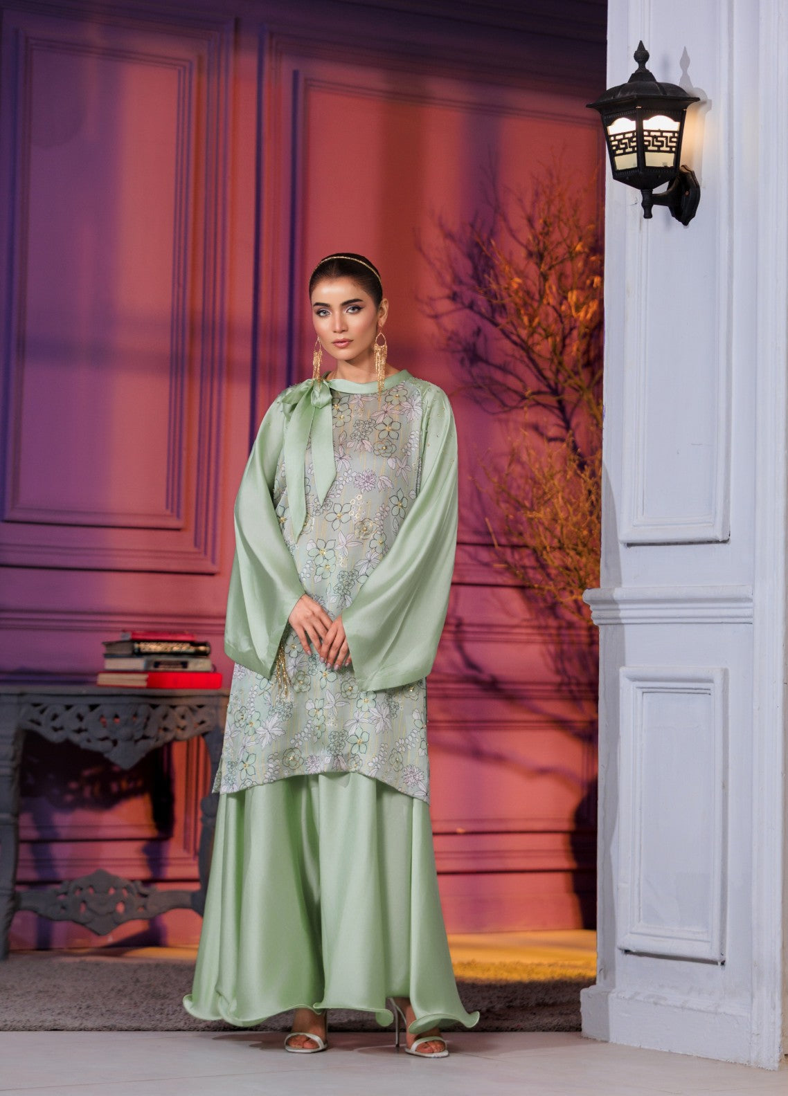 The Suhana 2-piece sublimation silk co-ord set features a contemporary geometric printed shirt with elegant embroidered details, paired with matching wide-leg trousers for a modern statement.