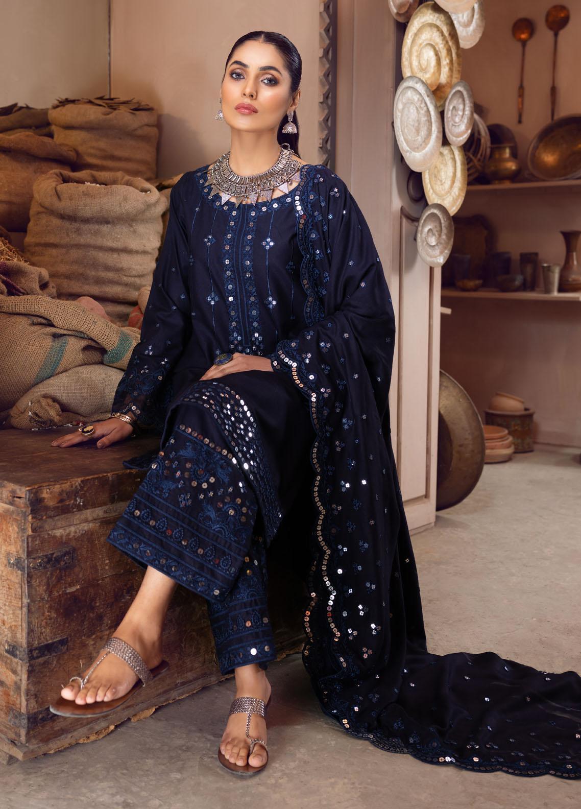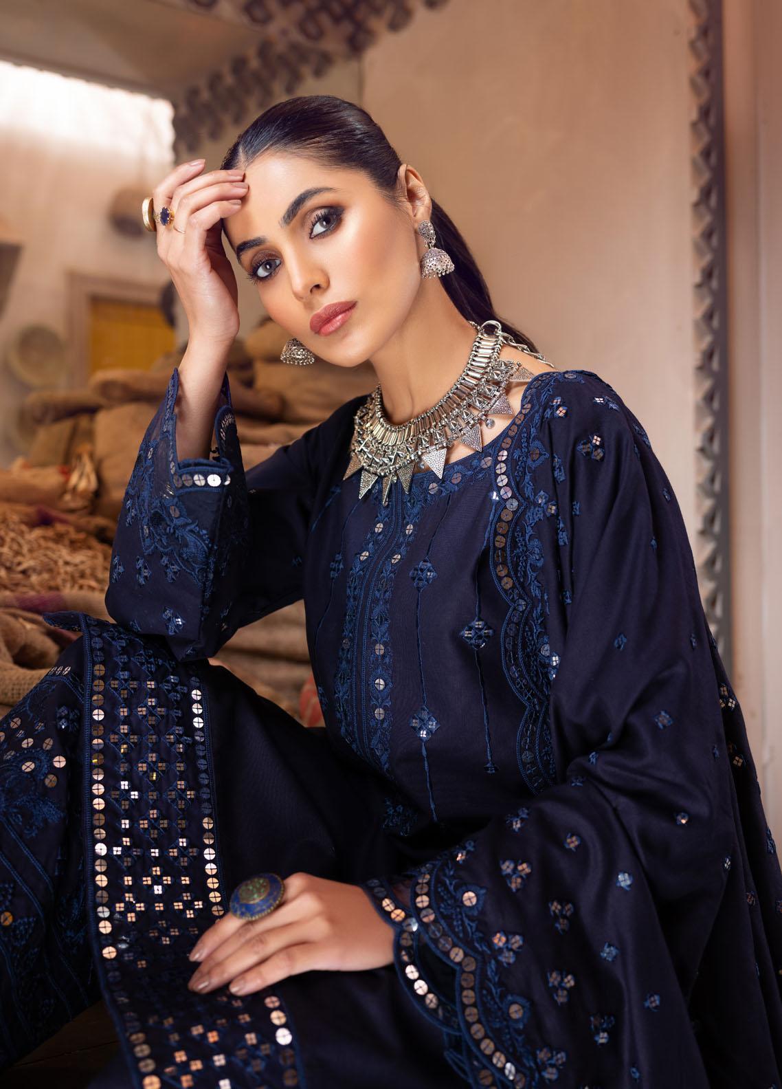 Exquisite long shirt with its charming navy blue gleaming canvas of soft pure khaddar featuring ethereal detailing. The shirt is composed of modern monotone embroideries accentuated with 9mm sequins work. The wondrous dupatta completes this look mesmerisingly with the enhanced borders and embroidery layered artistically on the cotton net canvas