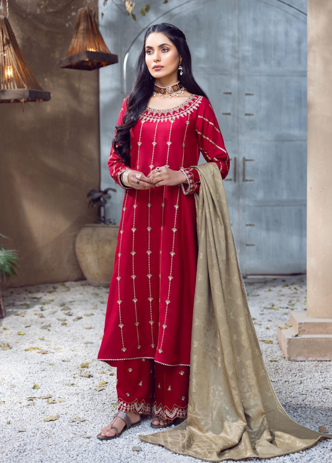 Moira is a spellbinding ethnic piece with artistic detailing of sequence work, tilla work, and three color embroidery. The shirt is layered with floral patterns beautifully adorned on a linen canvas. Paired along is graceful jacquard karandi dupatta with laced borders and linen pants with embroidery on the ends making this an outstanding fit for a winter day!