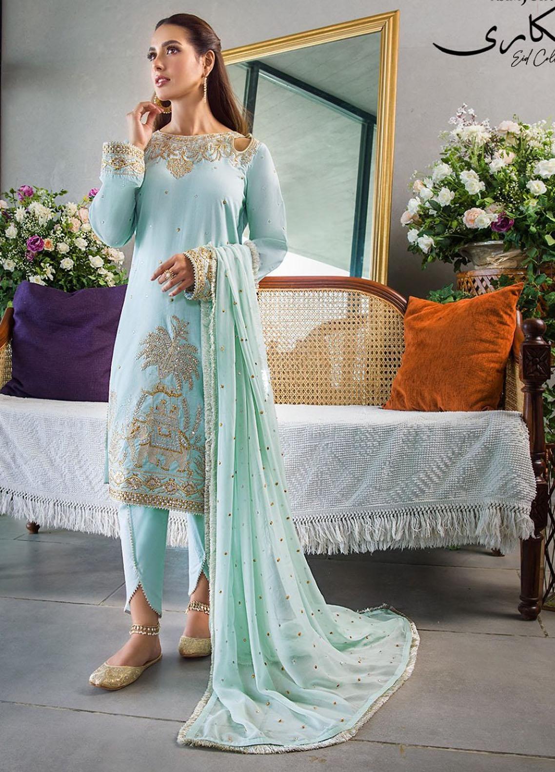 Iqra Aziz is a vision of elegance in this cool ice blue number. A unique design incorporating a distinct neckline and a hemline embroidery reminiscing a royal procession worked in dual colored mukaish with a touch of zari and sequins come together to execute this filigree design. The look is completed with sequined motif sprinkled chiffon dupatta and plain dyed tulip shalwar.