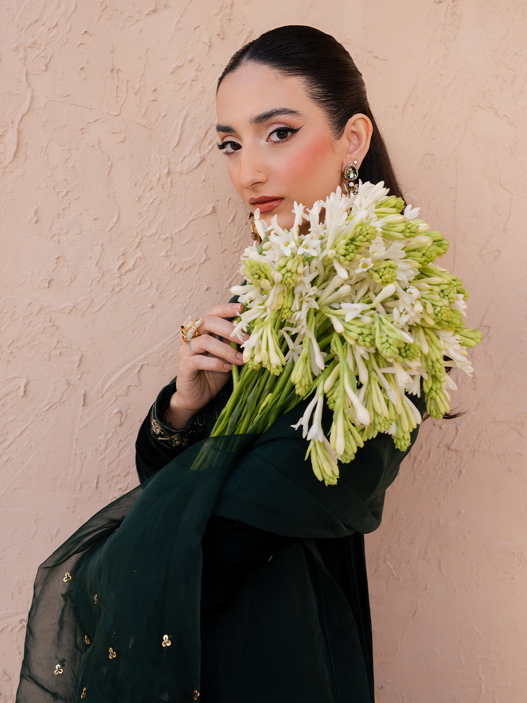 Solene from the Le Tresor Collection embodies timeless sophistication. The ensemble features an embroidered velvet front and sleeves complemented by an embroidered organza neckline patch and intricate front damn border. A plain velvet back and plain raw silk trousers provide subtle balance while the embroidered organza dupatta completes the look with a touch of refined elegance perfect for festive and special occasions