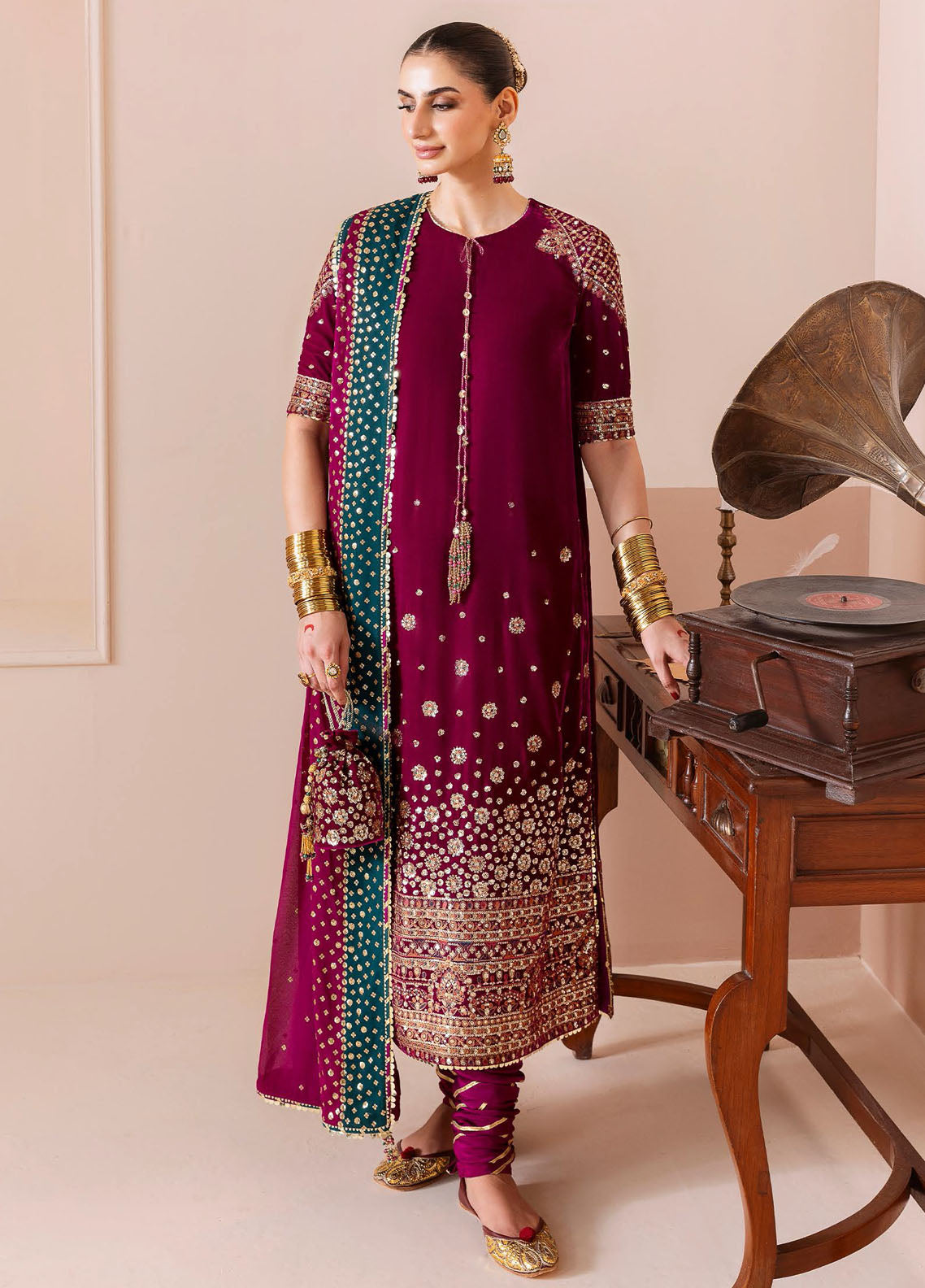 Embroidered Pure Velvet Front, Back & Sleeves Borders