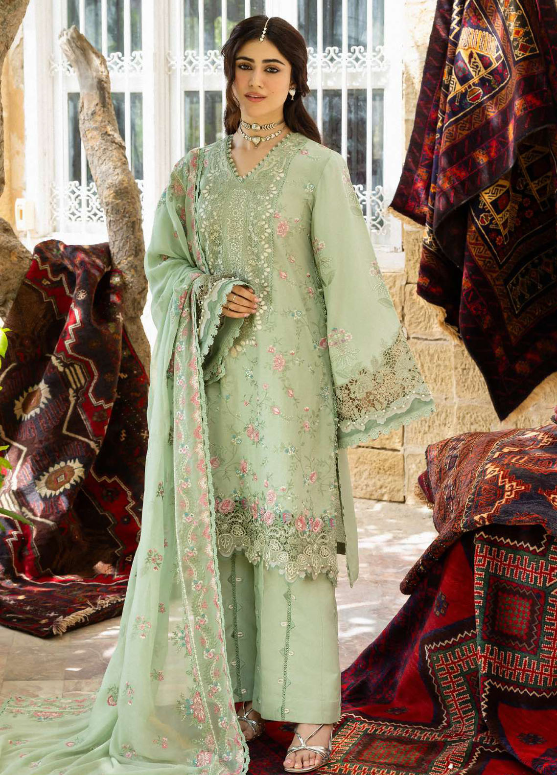 Karandi, adorned with intricate embroidery that elevates its serene charm.