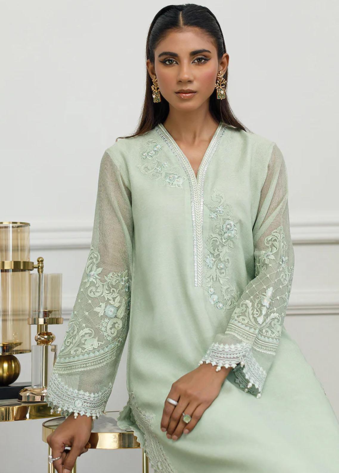 Ready-to-wear, khadi net fabric tunic in pastel shade of green, which is exquisitely crafted with embroidered motifs and scalloped borders, finished with pearls.