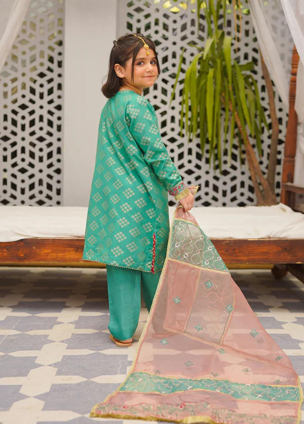 An epic blend of sea green with sparkling jacquard design, with a adda work on front neckline and gold zigzag lace is used for finishings on hem with a contrasting chat pati lace on side slits.. A cambric pants and a lipstick pink organza shade embraided dupatta with kiran lace complete the look.