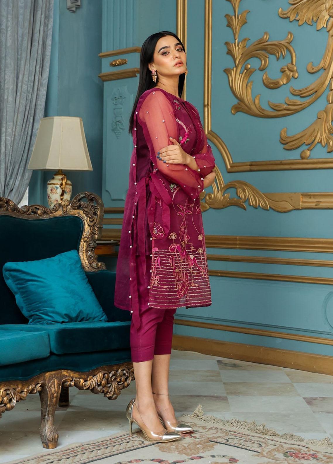 This plum outfit comes with gorgeous and and spreaded sequin embroidery in berry and green shaded. Asymmetrical organza shirt with tie detail on the waist. Paired with attached viscose lining.