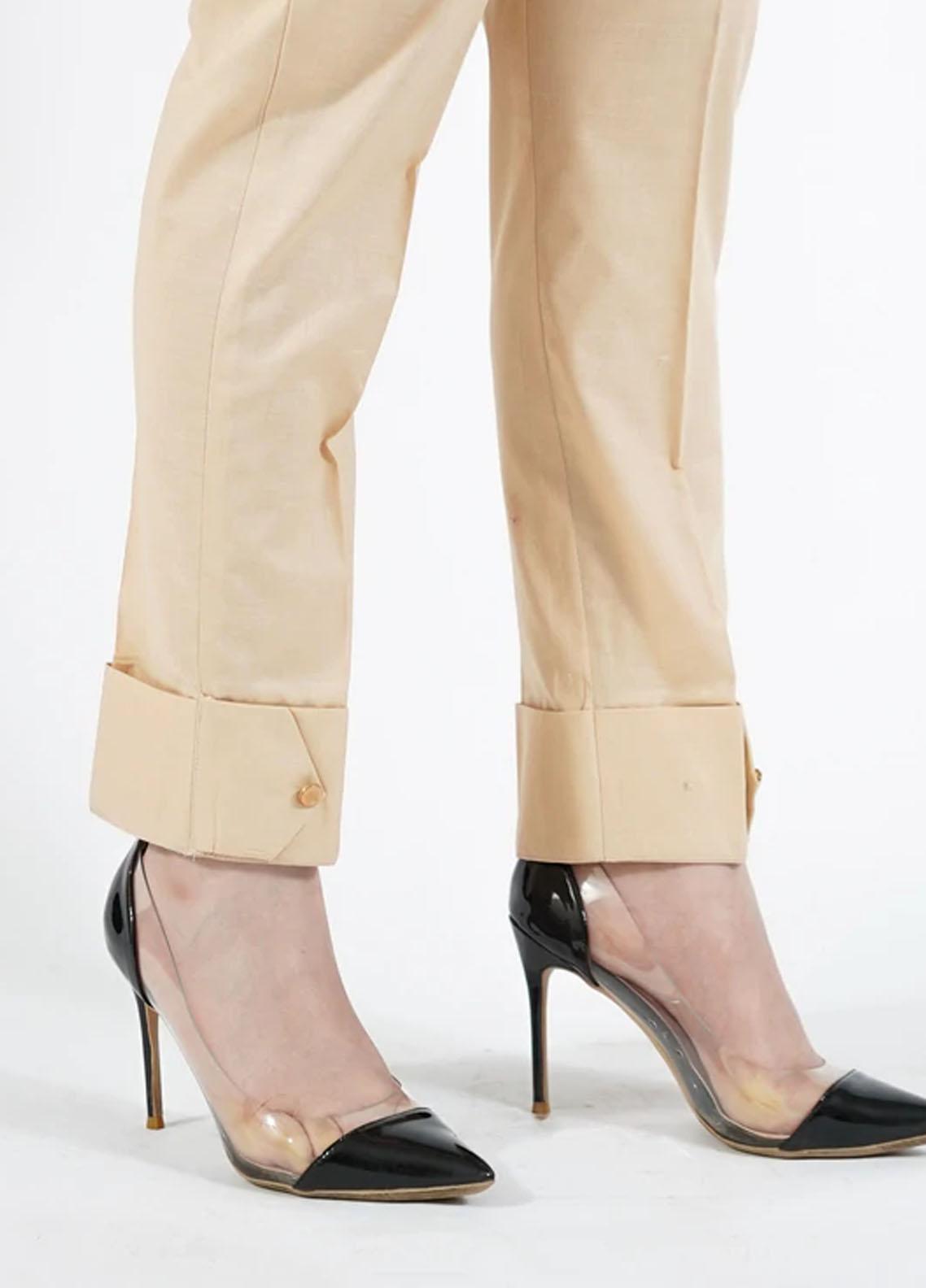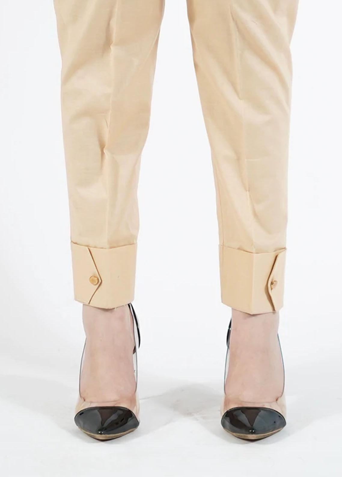 A Wardrobe Must-Have Is AnBeige Cambric Trouser With A Folded Hem.