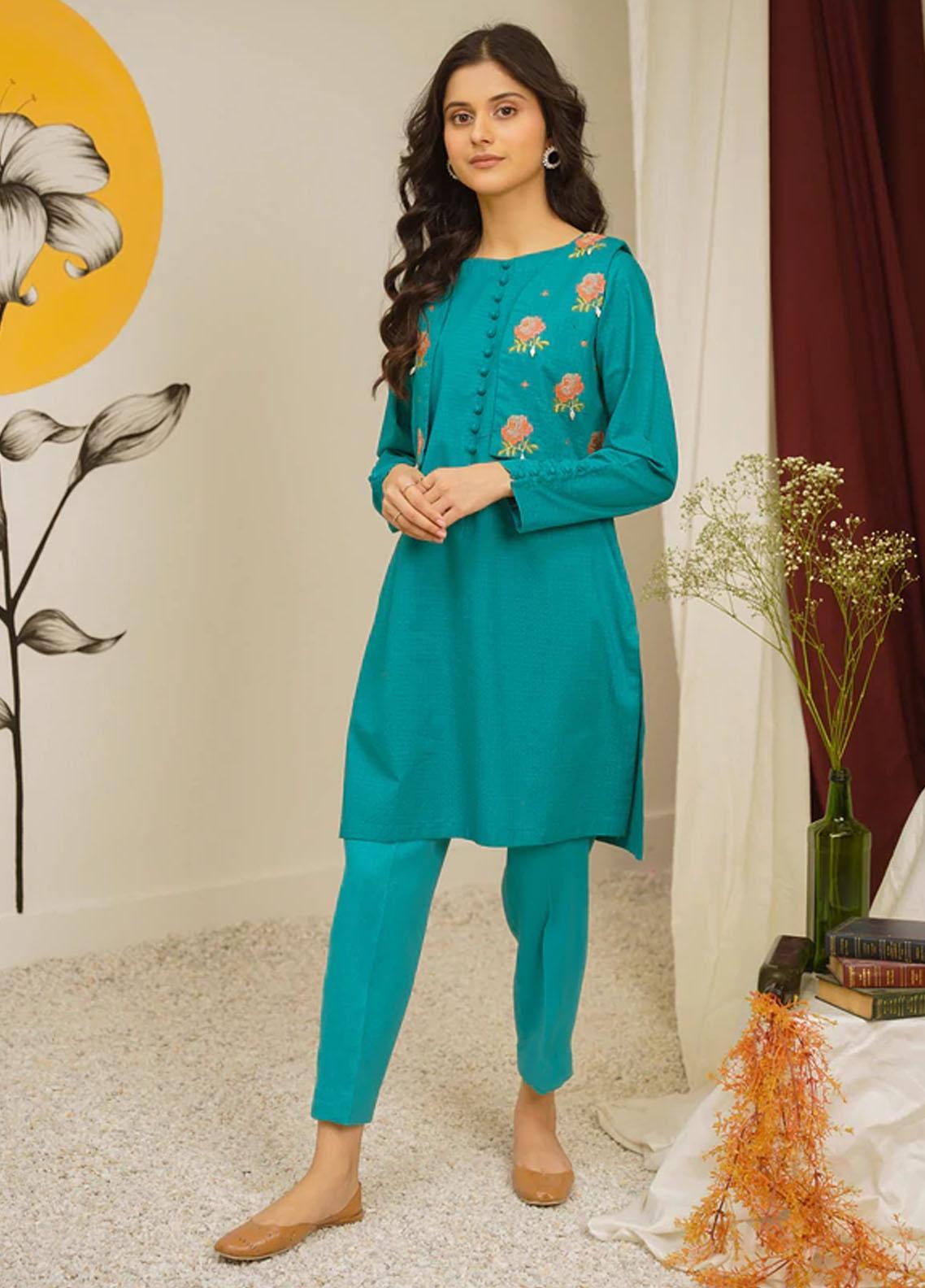 AFascinatingTealOutfitIncludingANicelyEmbroideredFrontOpenJacketAndAMatchingINnerShirtForAStyleStatementLook.