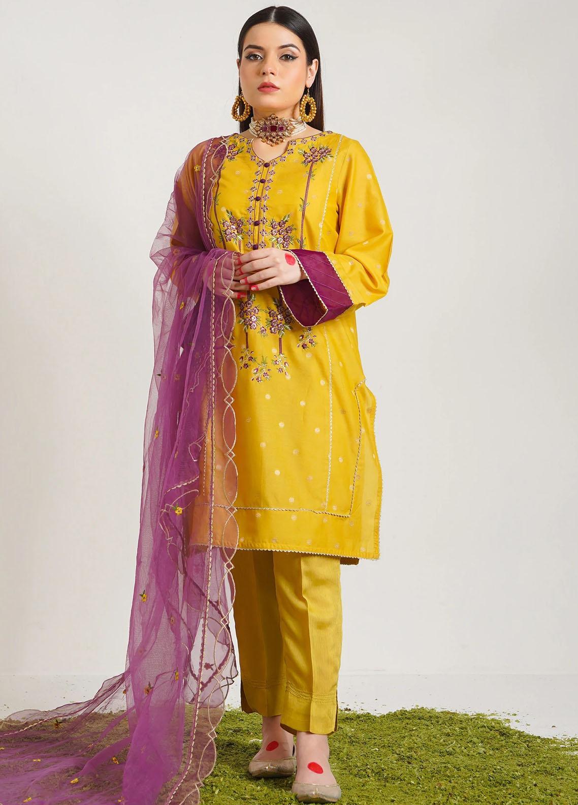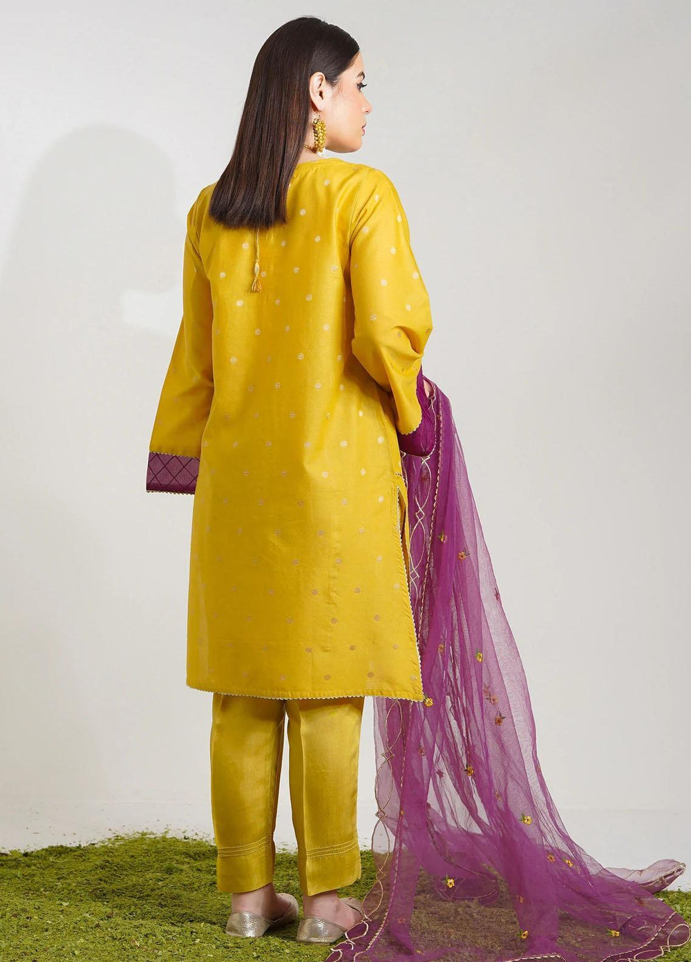In the rich mustard hue of this embroidered jacquard kurta, combined with an embroidered net dupatta, make a majestic statement.