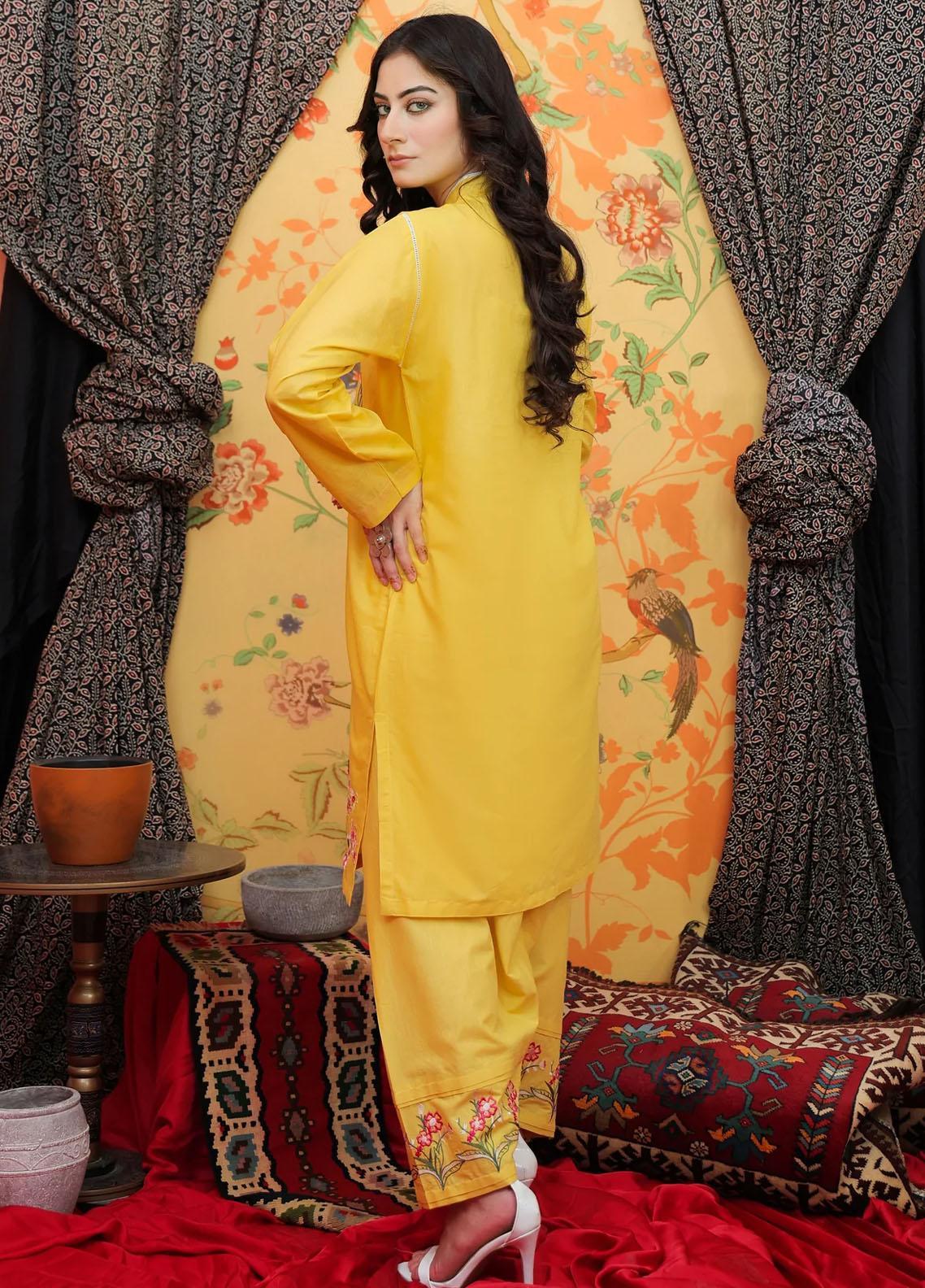 A yellow cotton shirt , embellished with floral motifs all over to give shirt a feminine look. Multi colored floral embroidery on the hem. To give a complete look this elegant shirt is paired with a matching plain cambric embroidered shalwar.