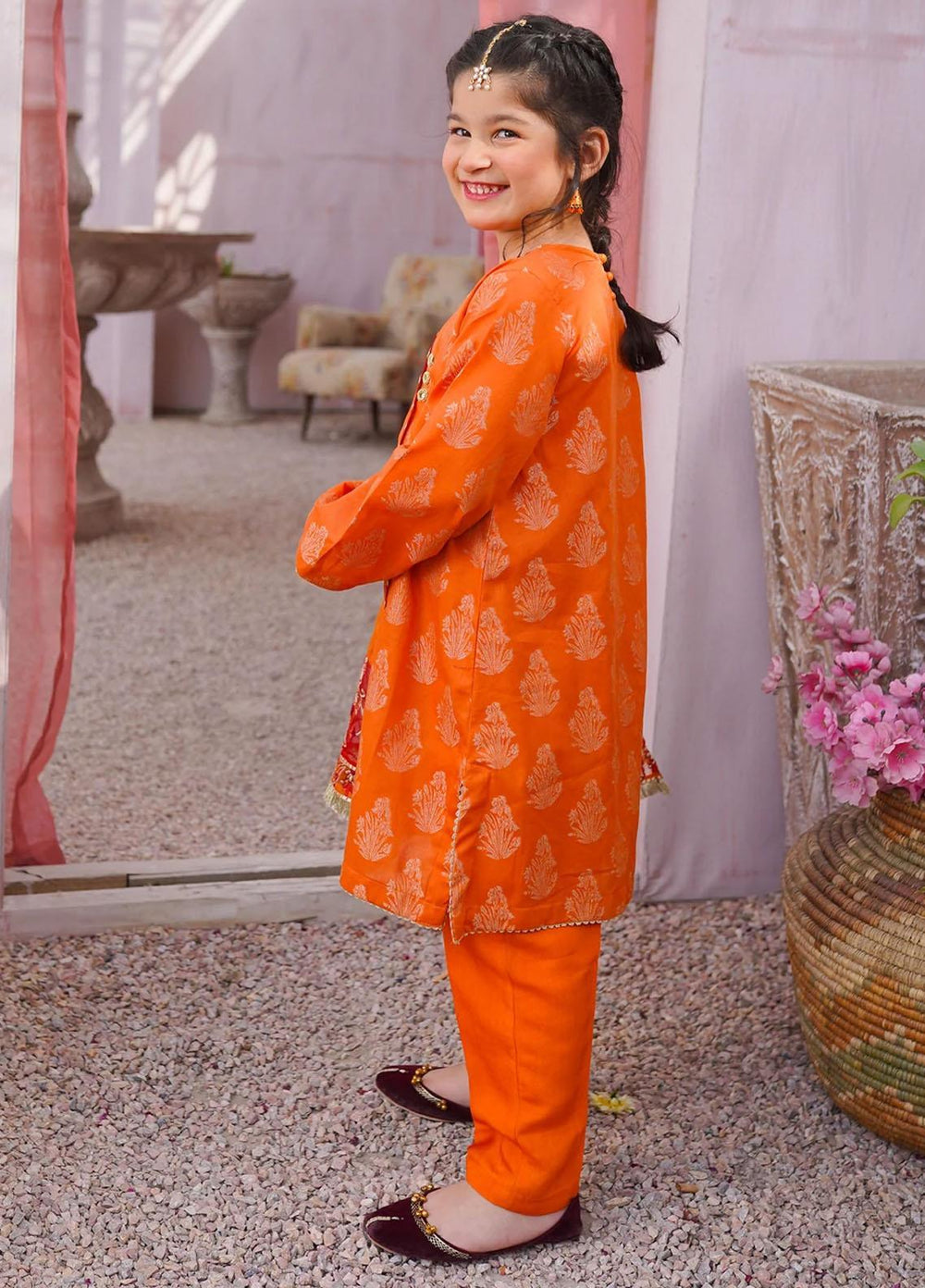 This traditional anghrakha cutline which is rendered with fire orange shade and to give it a more finished look ,gold lace is used on hem, side slits, sleeves and a contrasting fancy red color lace is added on front and sheesha buttons to enhance the ethnic feel of the outfit. Paired with tulip shalwar and organza embraided dupatta which has a contrasting borders on pallu.