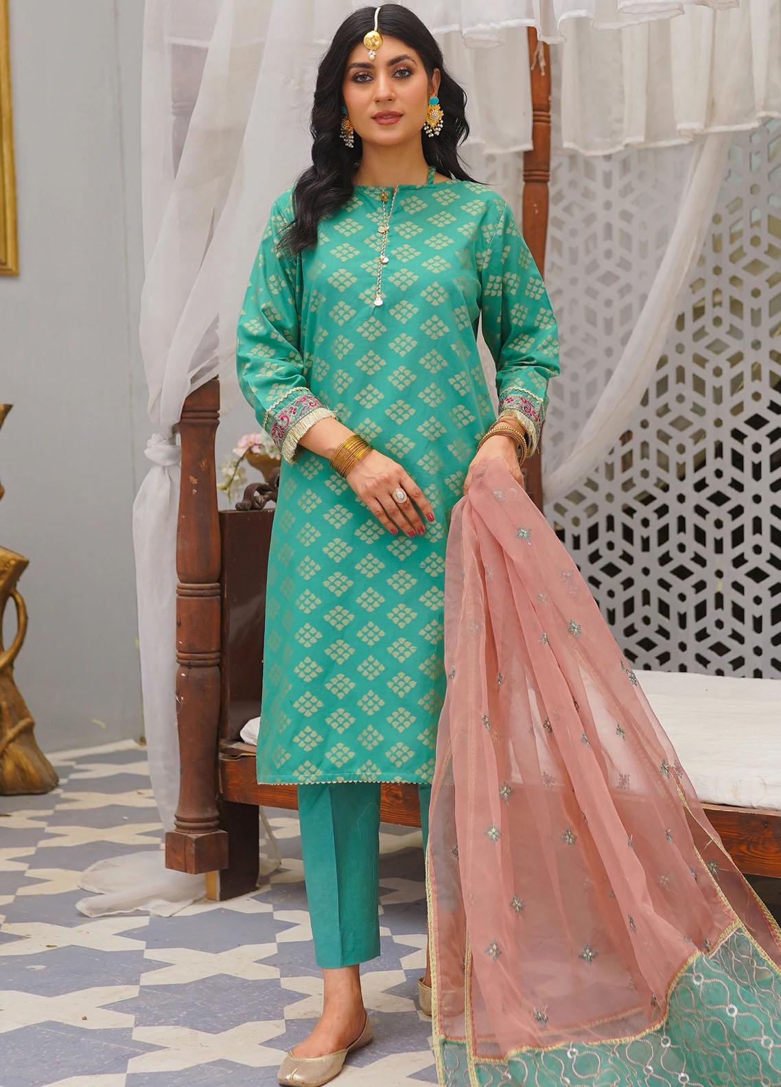 An epic blend of sea green with sparkling jacquard design, with a adda work on front neckline and gold zigzag lace is used for finishings on hem with a contrasting chat pati lace on side slits.. A cambric pants and a lipstick pink organza shade embraided dupatta with kiran lace complete the look