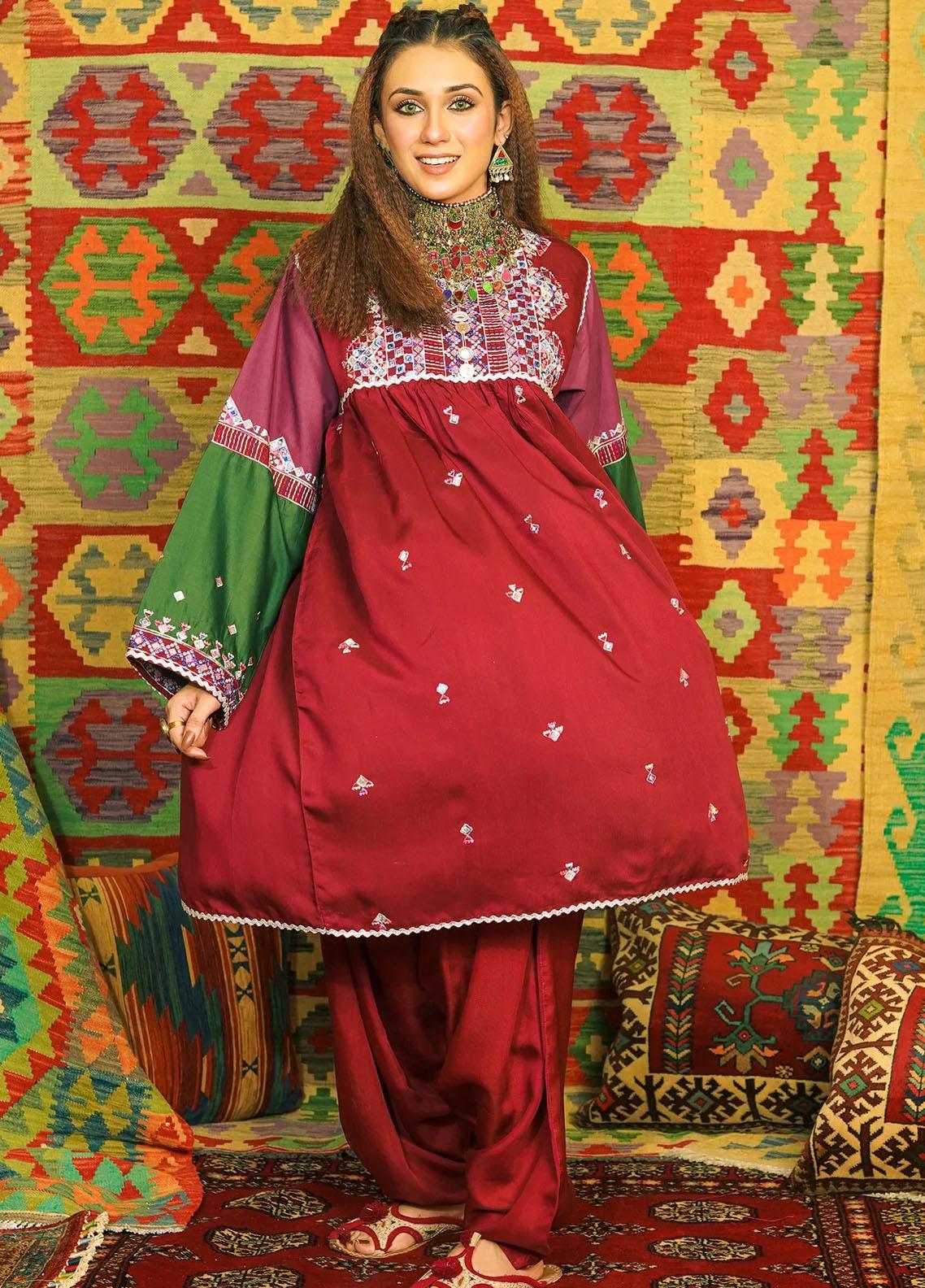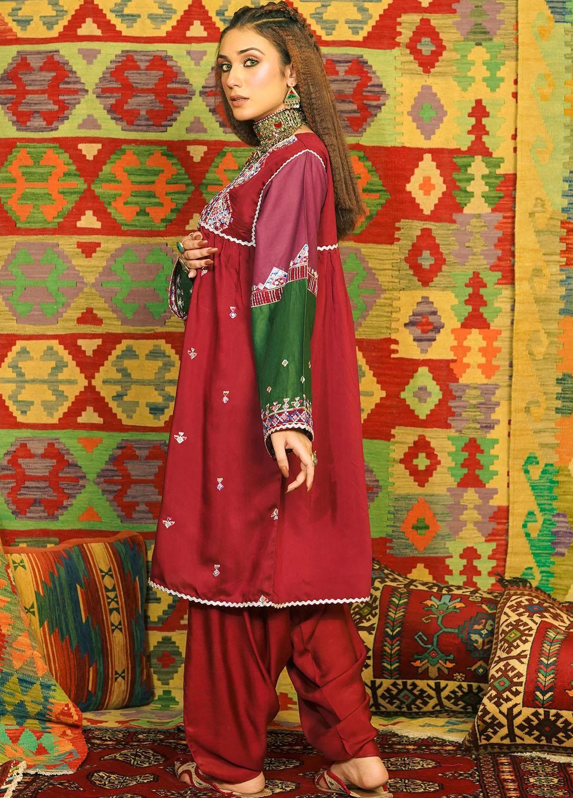 An aesthetically rich composition is portrayed on this viscose fabric ensemble rendered in an appealing cherry red shade. It features a classy mid length frock . Contrasting deep green shade is used in sleeves with a multi color resham embroidery on it. Style this ravishing outfit at fun occasions this festive season.