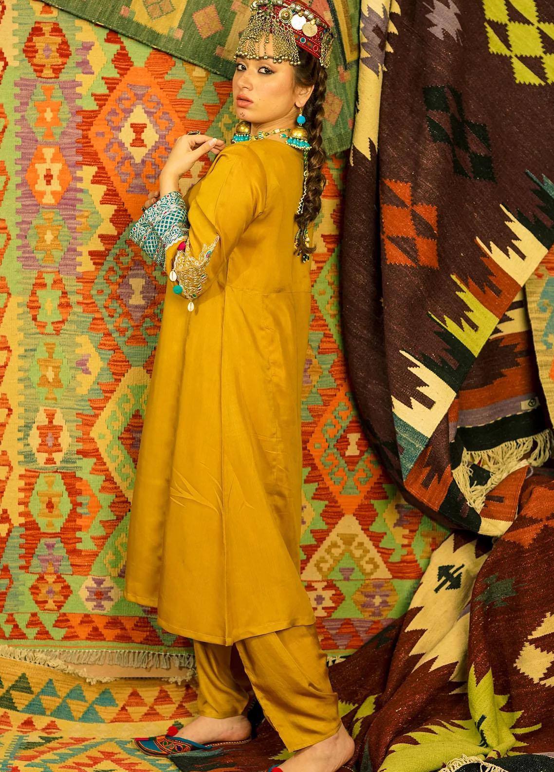 Wear this mustard A-line style frock with dori affect embroidery with silver tilla. Contrasting teal blue embroided border on sleeves hem and silver lace is enhancing the look of this outfit. Style this ravishing outfit at festive gatherings this celebratory season.