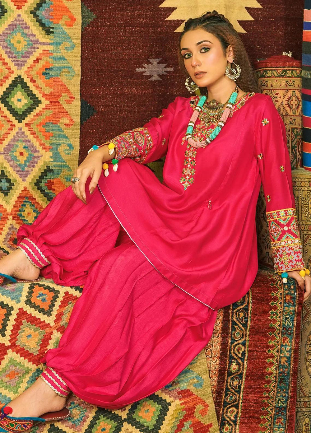 This ethnic composition of neckline and sleeves, inspired by tribal motifs and is presented in a lovely pink tone. Coins, pompoms, shells and beads are adding more detaling to this outfit and can be paired with pathani shalwar.