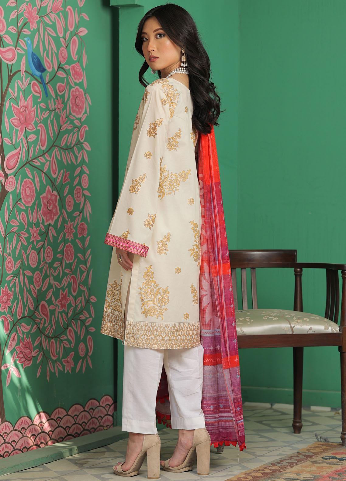 This unstitched cream canvas features a gorgeous light gold screen print design. Its completed with a vibrant dupatta and a dyed cambric trouser.