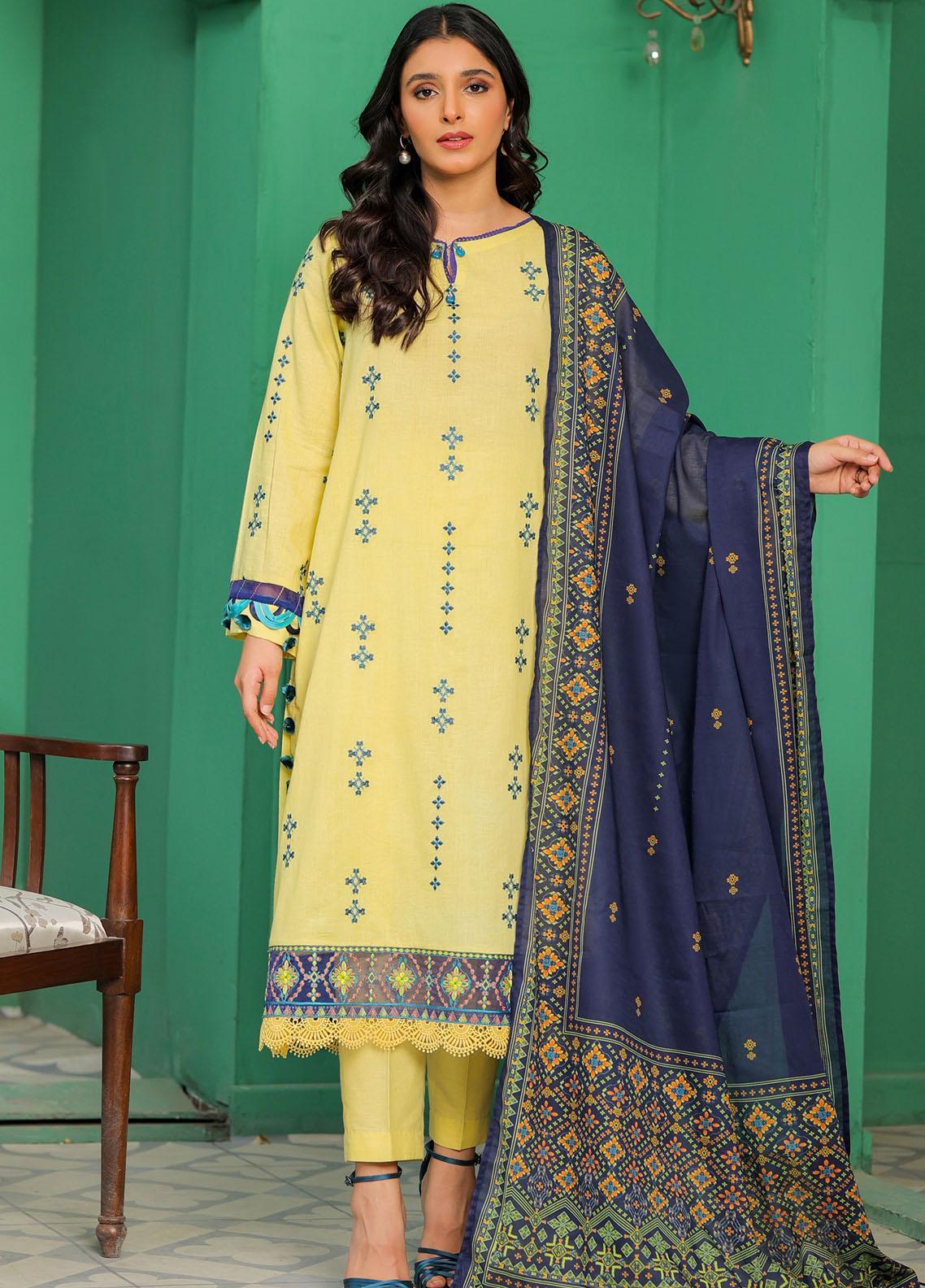 This unstitched light yellow lawn shirt withfully embroidered front and organza patch will brighten your day. Finished off with a patterned blue dupatta and cambric trouser