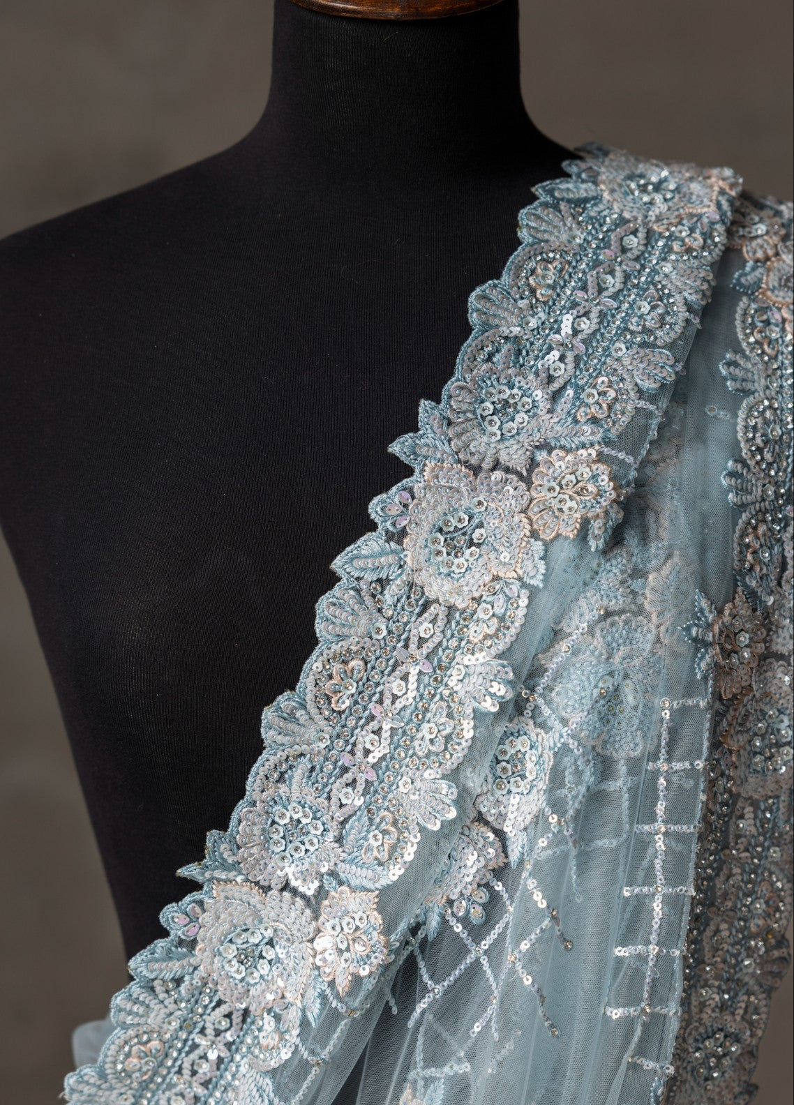 A light gray net saari featuring heavy scalloped borders, and floral and geometric pattern. Embellished in intricate threadwork, sequins and sworoskies. This includes a complimenting unstitched, embellished blouse.