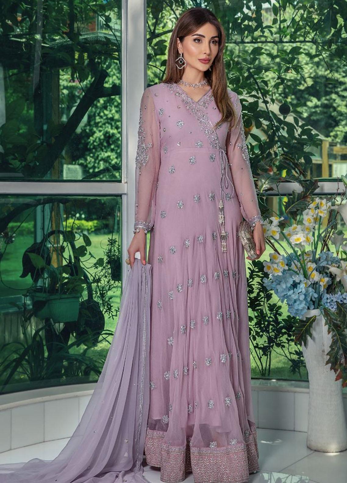 This is a 3 piece stitched outfit Angrakha Trouser and Dupatta. Rendered on a blissful lilac canvas Laila features on all over delicately embroidered spray with floral sequins and borders. This elegant angrakha style frock accompanied by an array of exquisite borders in tones of lilac and silvers embellished with pearls and sequins. A beautifully embroidered dupatta adds festivity making this grand design one of our favourites in the collection.