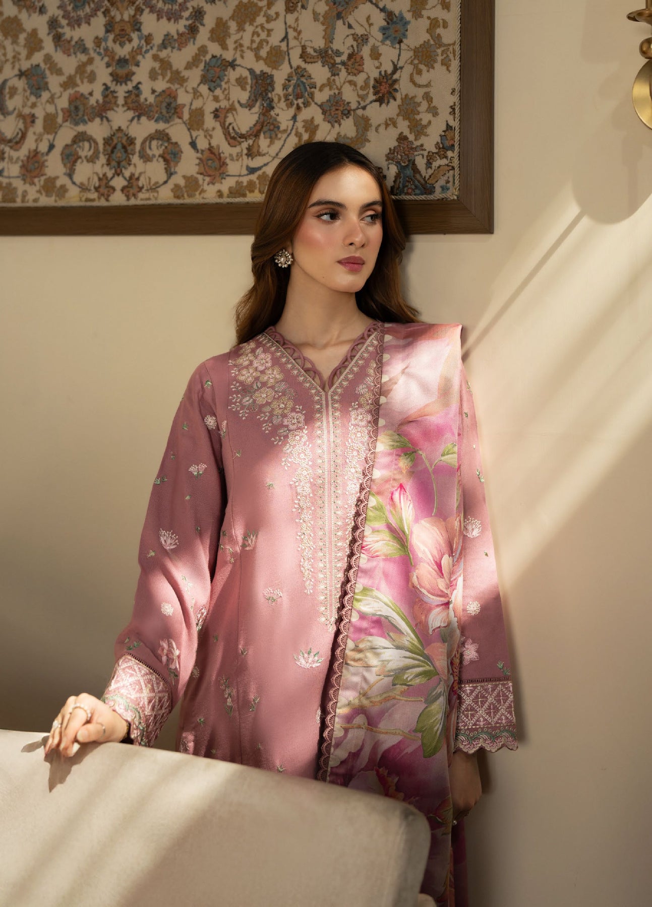 PEONETTE, in soft pink with delicate pastel embroidery, paired with a floral shawl that wraps you in gentle warmth—where winter days meet elegance, and every fold whispers serenity.