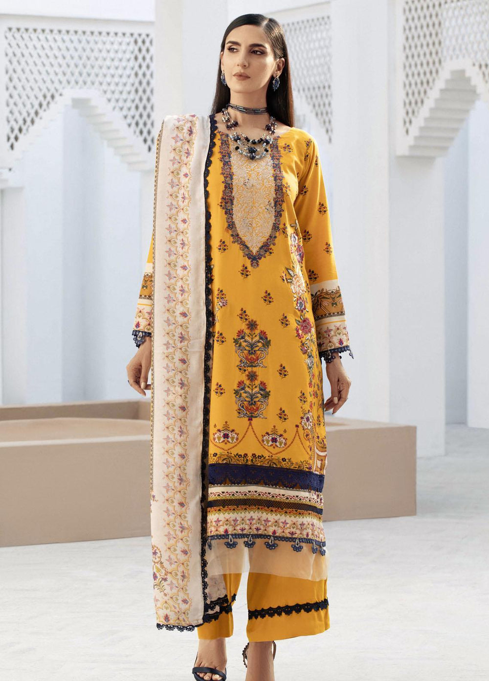 This collection is combination of cool and warm hues which gives you a choice form light as mint green to darker shades like navy blue which is ideal for day to evening casual breathable wear, the prints are inspired with architecture art along with pretty traditional floral prints, ample detailed embroidery in done over shirt border. So make your summer more beautiful and amazing by Lala textile lawn collection.