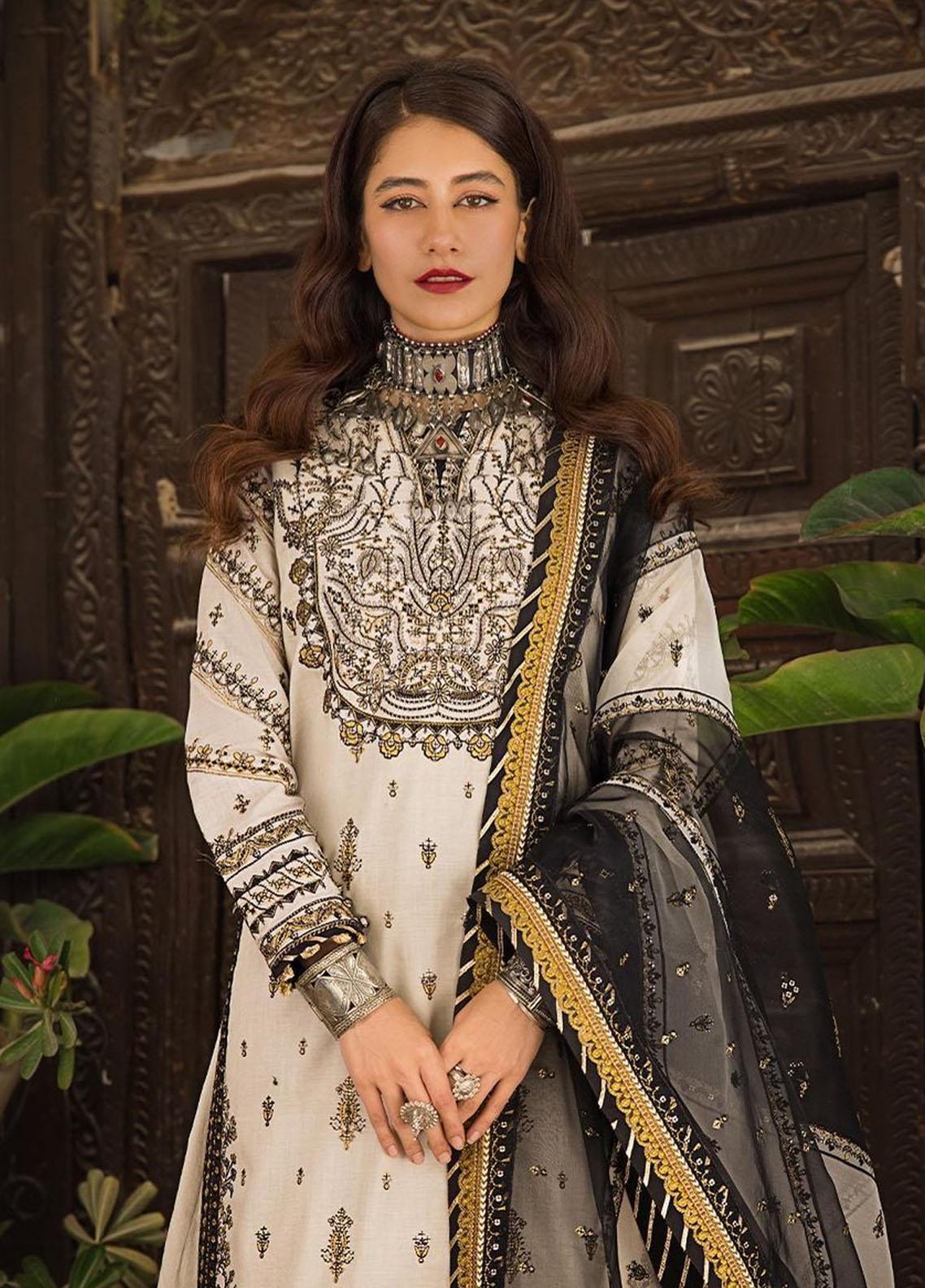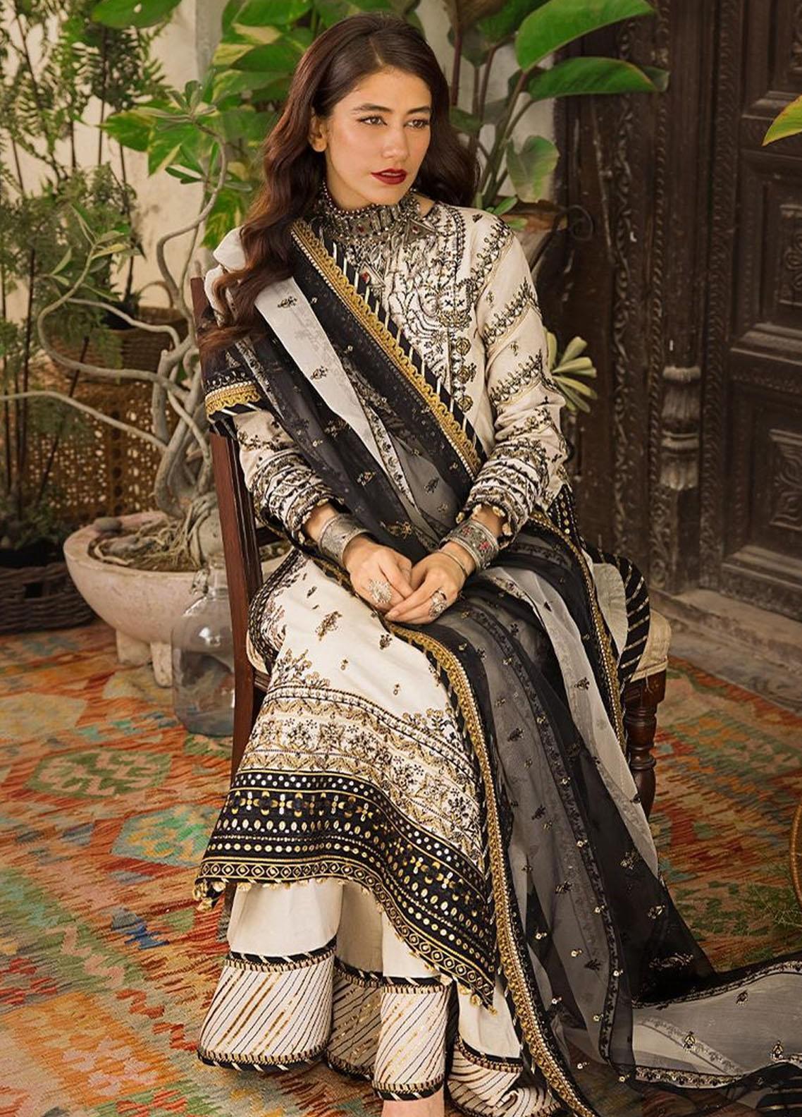 A classic combination of beige and black comes together in this design etched with antique gold zari and matte 5mm sequins rendering it with this luxurious feel. The shirt is hemmed with double embroidered heavy borders on two colors balancing the overall look. It comes with dyed pants and an interesting dual colored embroidered organza dupatta creating an eye catching stripe pattern.