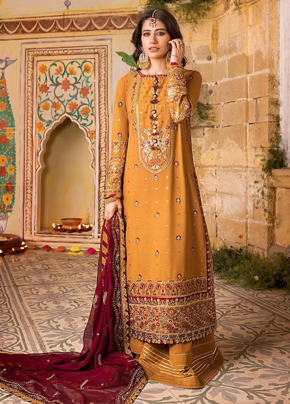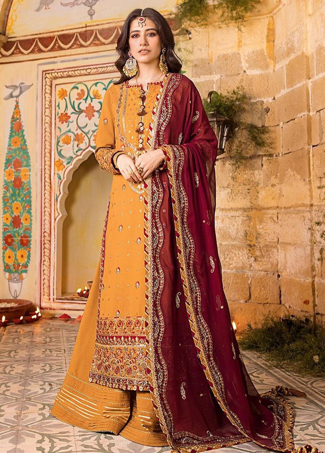 A beautiful sunset hue off sets this rustic design with all over embroidery topped with front and back necklines and heavy borders uplifting the look. It comes with an embellished Indian maroon colored chiffon dupatta and dyed trouser befitting the vibe of this design. Looking classy Syra Yousuf wears it with panache.