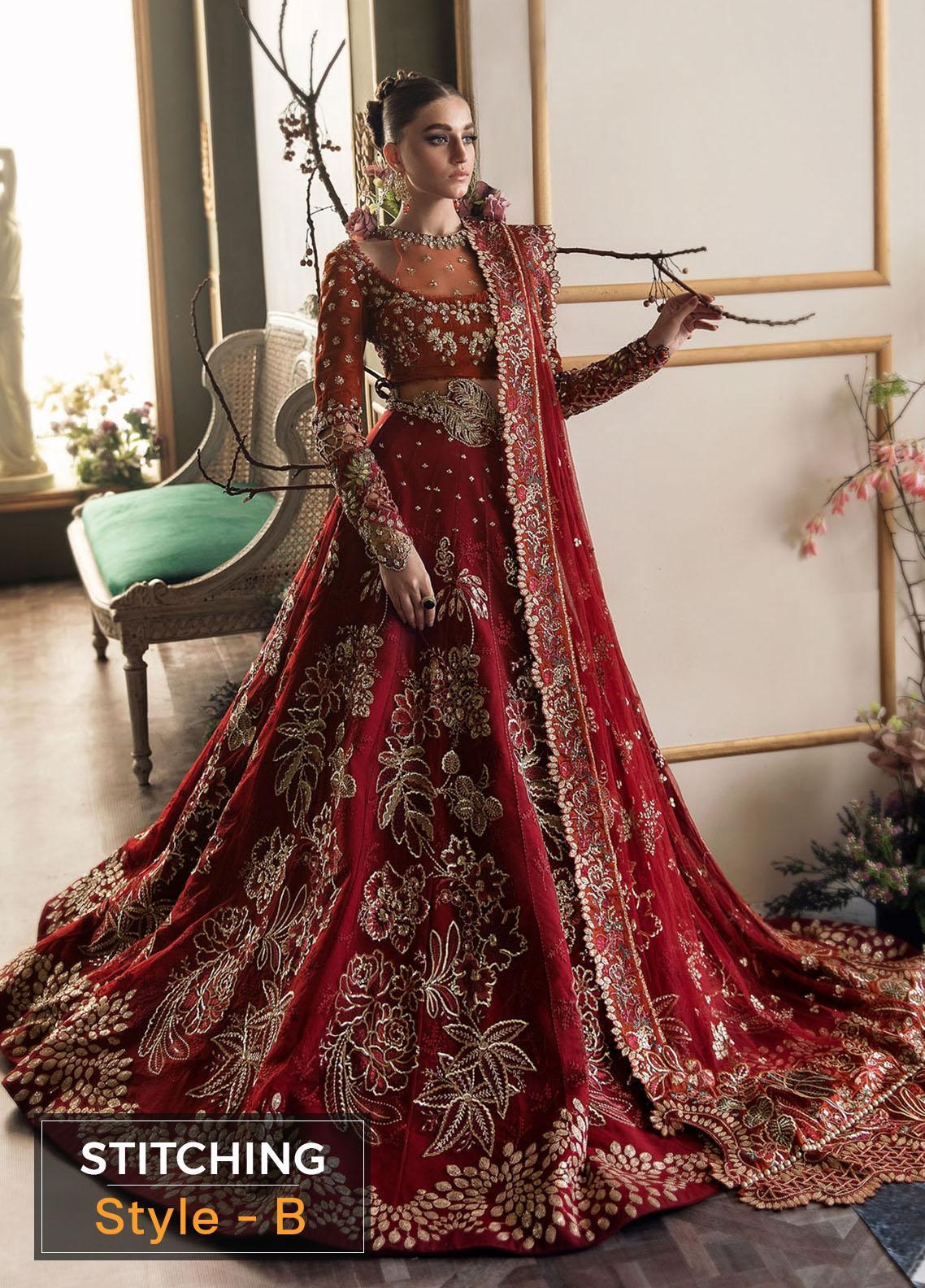 A beautiful barn red is offset with a sumptuous cherry and rust hue and adorned with intricate gold and cherry threads and rouge with hints of gold tinsels that scintillate with irredescent pearls glistening sequins and handwork embellishments .The tessellated cutwork pattern on the sleeves creates a captivating design for the shirt which comes paired with a tonal trouser and an embellished net dupatta enhanced with gilded rust scalloped borders with the belt. This stately look is a must have, comes with 12 panels which can be stitched as a bridal Lehanga as well as Pishwas.