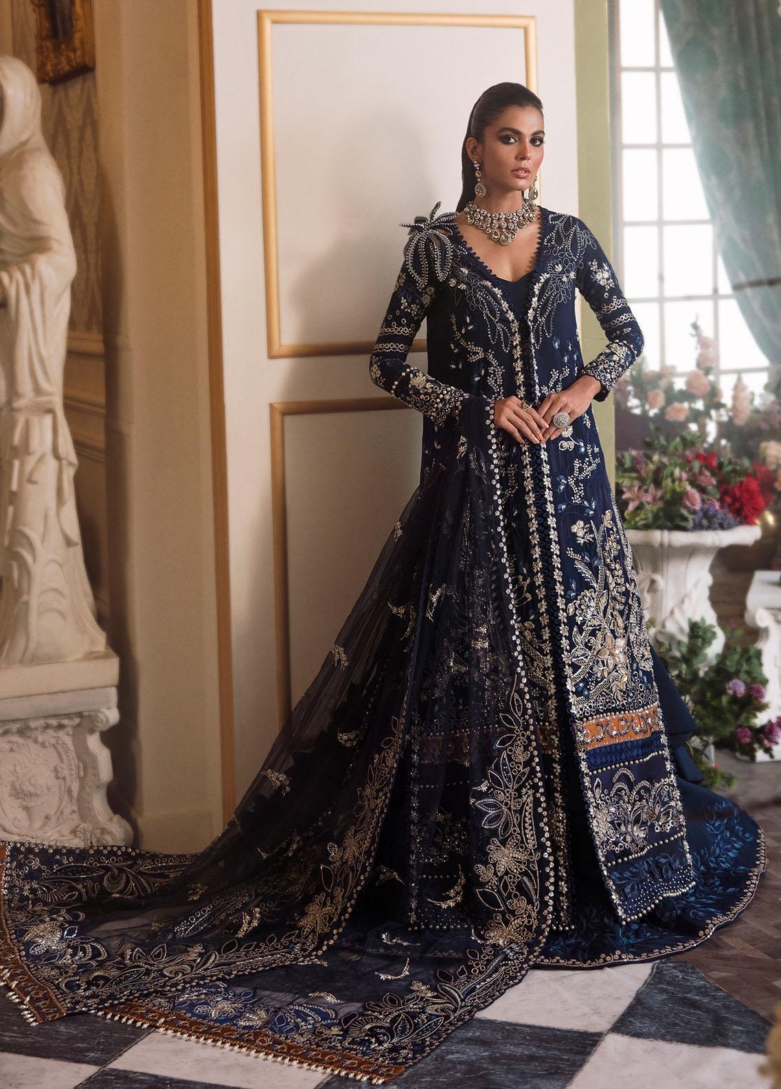 A tapestry of unparalled trees, vinning leaves, decorative florals in an oak silk midnight twp panelled jacket long shirt Une Campansule features intricate handcrafted details in dabka, gota, zardosi and pearls. Paired with an embroidered net dupatta with a shimmering ochre borders and scattered motifs is hung with intricately made tassels. Adding glamour with the printed tonal lehanga border.