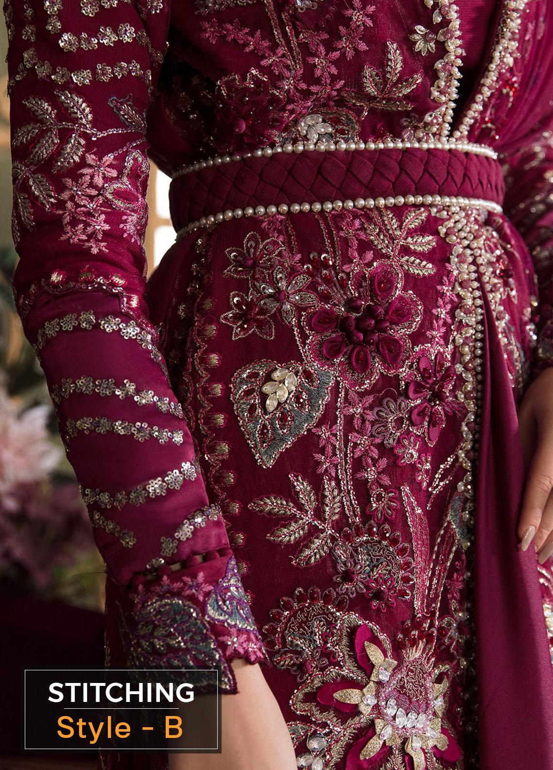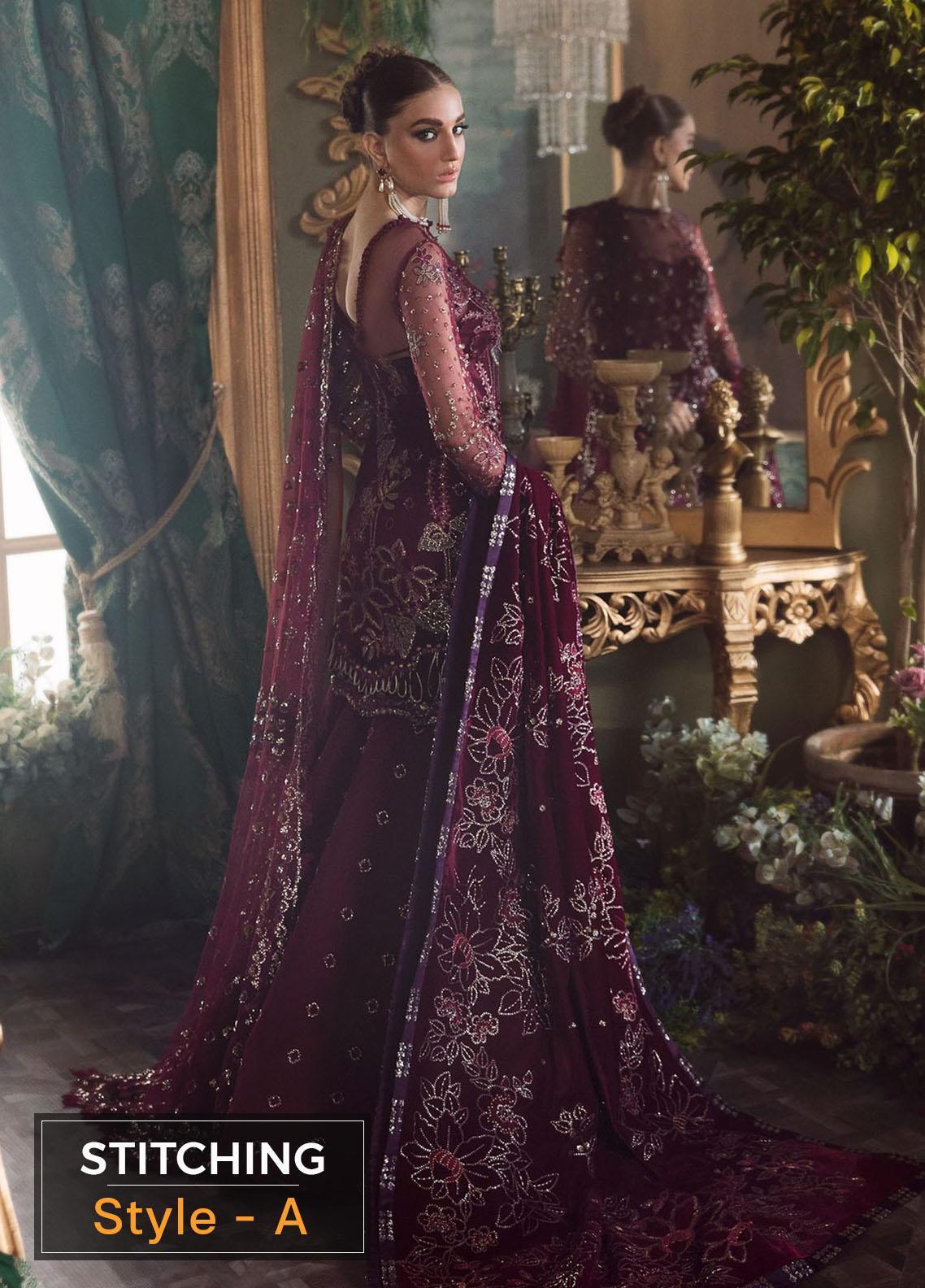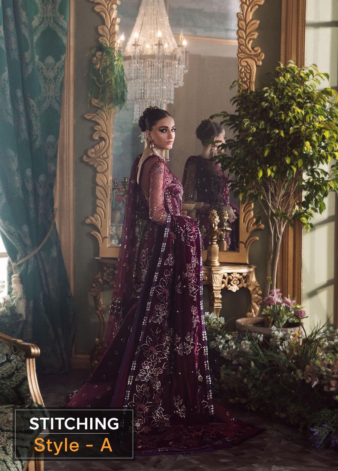 A wine color net shirt is composed in embroidered and embellished floral and leafy stalks of lilies,pensys and irises. A heavy jewelled neckline is set in pearls and crystals to make a statement with wine color satin sequins border in feathery and floral details on hem.