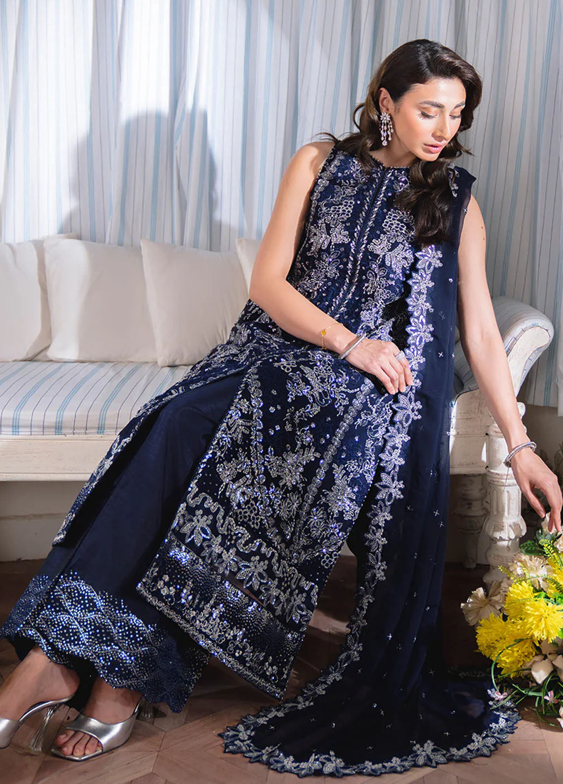 delicate zari tilla that glint like starlight on midnight silk. The matching chiffon dupatta, with its