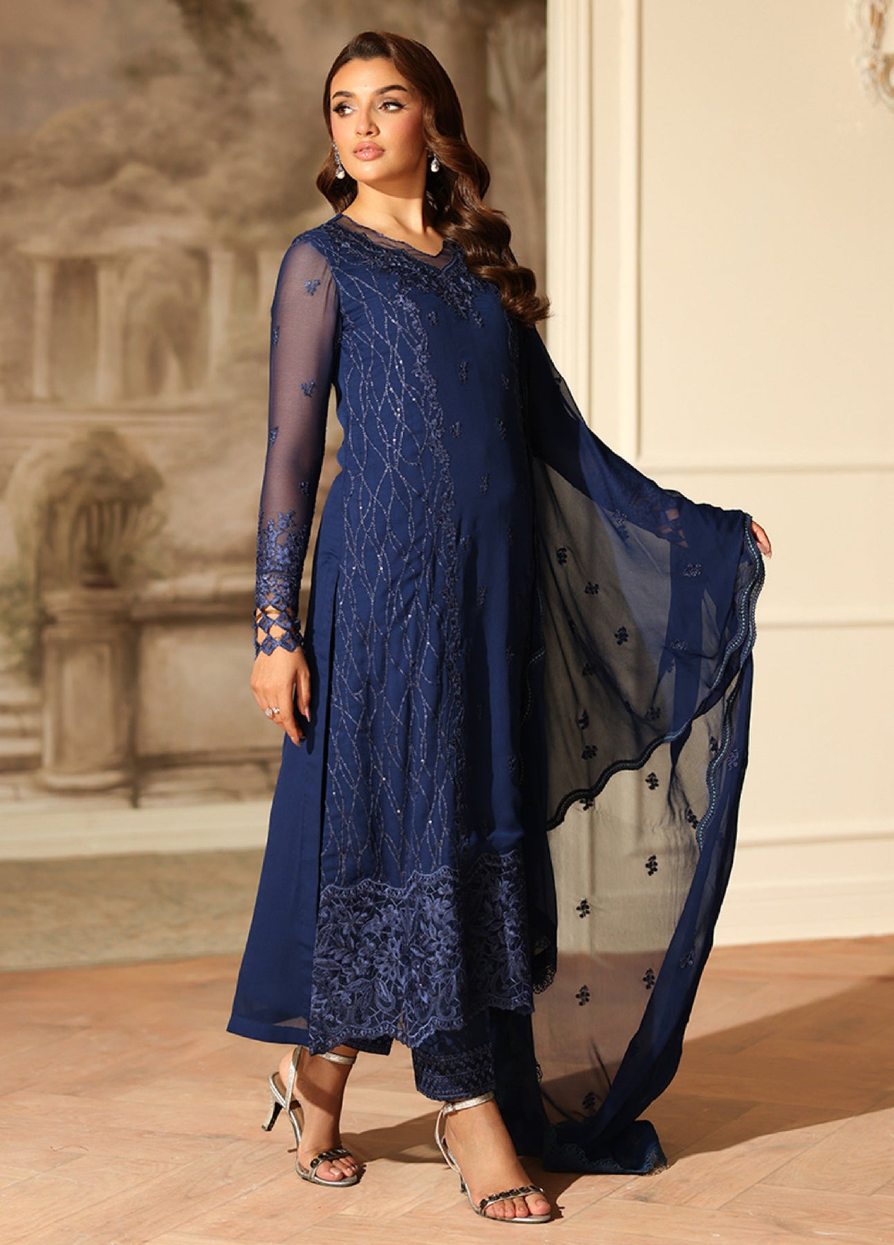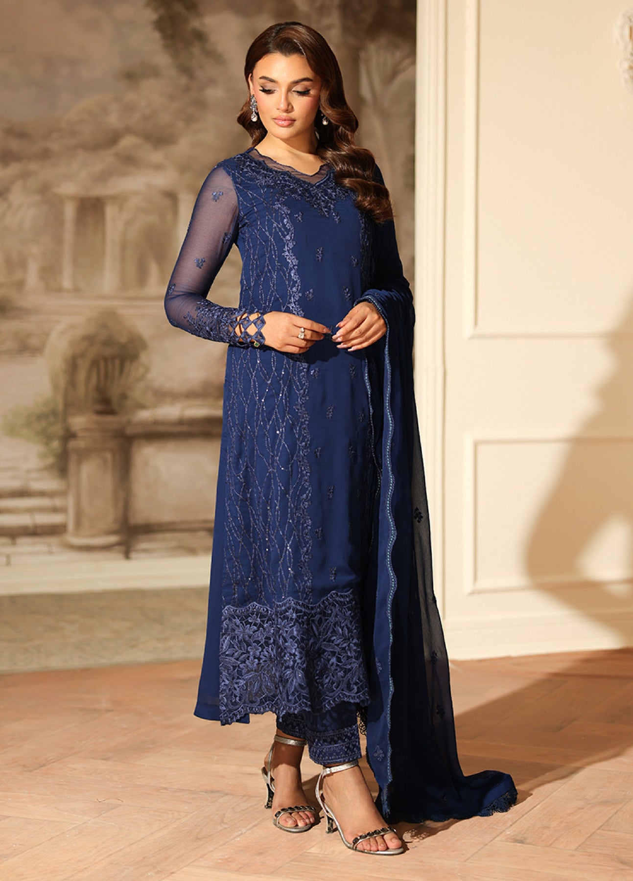 Royal Eclipse – Draped in a striking royal blue chiffon, this ensemble is the epitome of refined elegance. The look is accentuated with a glistening sequin embroidered chiffon dupatta, while tailored straight pants complete the silhouette with effortless grace. A statement of timeless sophistication, Royal Eclipse is perfect for evening occasions that call for poise and allure.