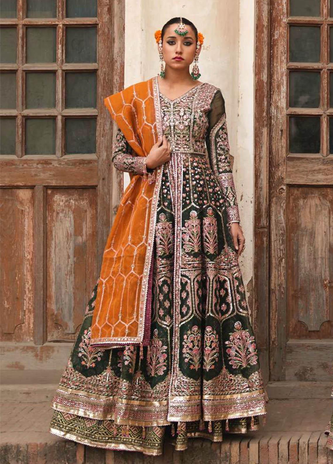 Fasana this green pishwas is donned with floral motifs and bunches in hues of pink, purple, coral and green threads, along with gold sequin and tilla work. Layered with pearls, naqshi and pipes. Paired with complementing organza dupatta and screen printed Indian raw silk sharara.