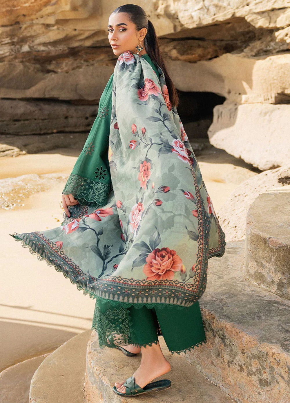 Safeera by Flossie Embroidered Chiffon Suits Unstitched 3 Piece FL24SF S-1304 Luster Green - Luxury Collection
