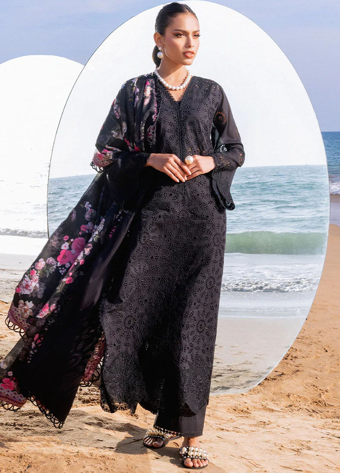 Safeera by Flossie Embroidered Chiffon Suits Unstitched 3 Piece FL24SF S-1302 Dark Veil - Luxury Collection