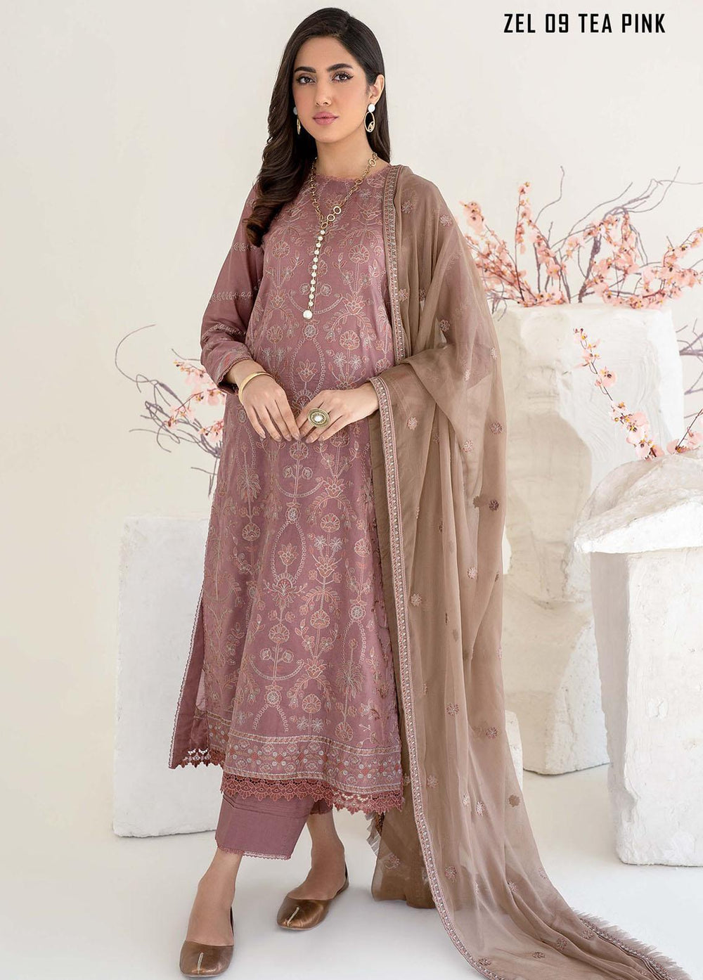 Zarif Embroidered Lawn Suits Unstitched 3 Piece ZF23L ZEL-09 Tea Pink - Luxury Collection